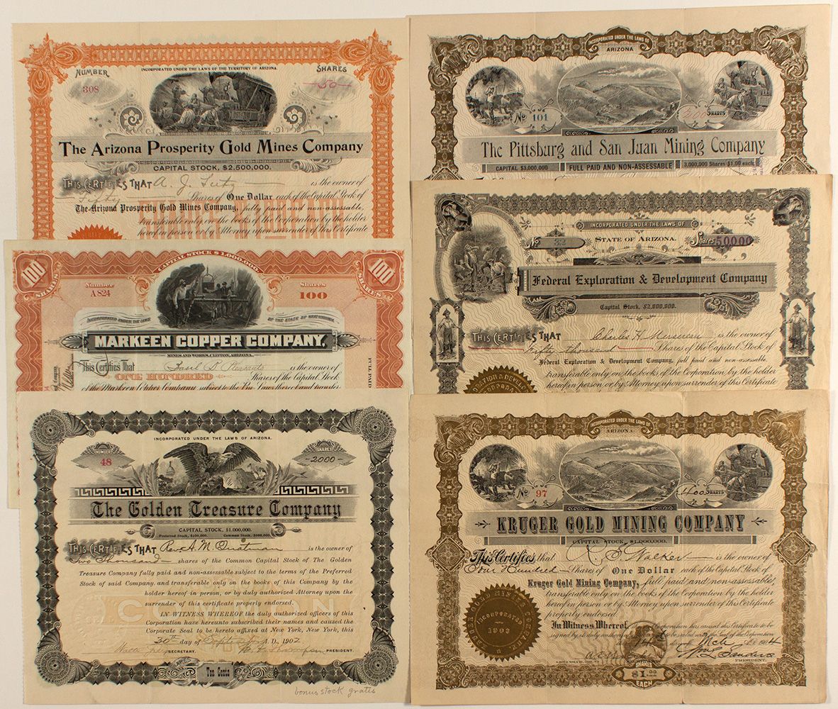 Six different mining stocks incorporated in Arizona. 1)The Arizona Prosperity Gold Mines Company (A.T.), issued at Chicago in 1902. Oval mining vignette and revenue stamp glued to the corporate seal. Unc. 2)The Golden Treasure Company (AZ), issued at New York in 1902. Eagle vignette and orange underprint. Unc. 3)Kruger Gold Mining Company (AZ), issued in 1904. Three mining vignettes. Unc. 4)Markeen Copper Company (WV), issued at New York in 1904. Mines and Works at Clifton, Arizona printed on certificate. Great vignette of miners using pneumatic drills we haven't seen before. Nice engraving by ABN. Unc. 5)The Pittsburg and San Juan Mining Company (AZ), issued at Pittsburg, PA in 1905. Three mining vignettes. Unc. 6)Federal Exploration & Development Company (AZ), issued at Paterson, N.J. in 1910. Seven mining vignettes. Unc. Most of these are VF.City: County: State: AZDate: 1902-1910