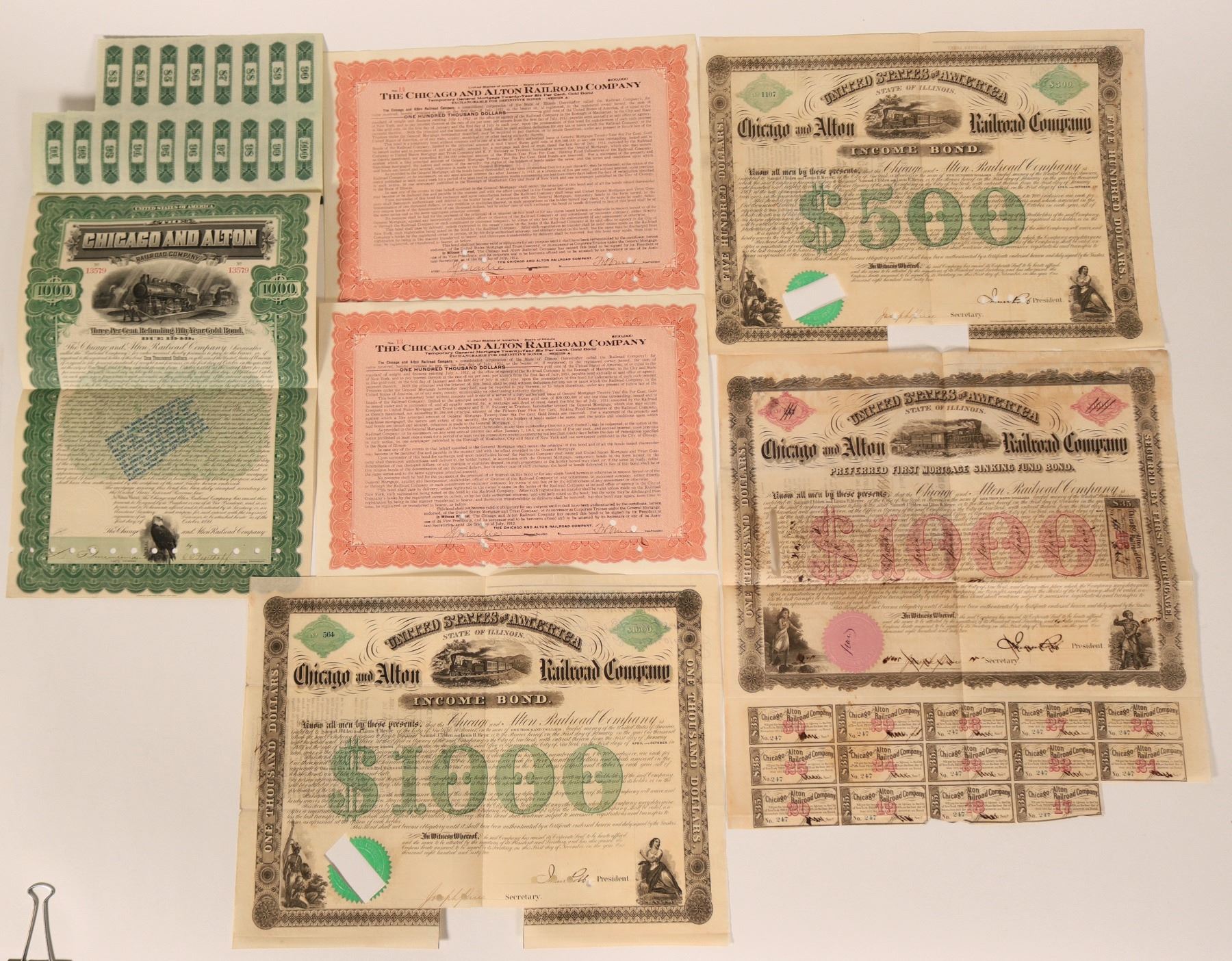 Lot of 6, five different. Three different issued in 1862 ($500, and two $1,000), cut-out cancels, locomotive and allegorical vignettes. Also, a $100 bond issued in 1899, punch cancelled, locomotive vignette; and two $100,000 issued in 1912, punch cancelled. The Joliet and Chicago Railroad was chartered February 15, 1855 and opened in 1856, continuing north and northeast from Joliet to downtown Chicago. It was leased by the Chicago & Mississippi, providing a continuous railroad from Alton to Chicago. In 1857 the C&M was reorganized as the St. Louis, Alton and Chicago Railroad, and another reorganization on October 10, 1862, produced the Chicago and Alton Railroad. The C&A chartered the Alton and St. Louis Railroad to extend the line to East St. Louis, opened in 1864, giving it a line from Chicago to East St. Louis. City: Chicago State: Illinois Date: 1862-1912