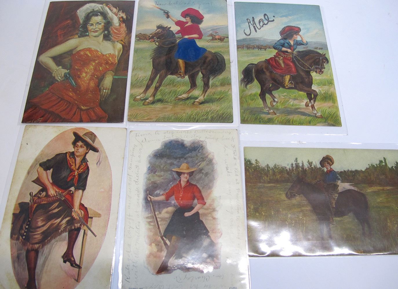 1) Sketch of Pauline Cushman of Tombstone - actress, spy and seducer of men. 2-3) Two bright colorful photos of 'May.' 1908. 4) "A daughter of the west - cute, young, and loaded! 5) 1907 of another cowgirl holding a rifle. 6) A cowgirl on a horse with a rifle and "Looking for Game." Date: Location: HWAC # 53960