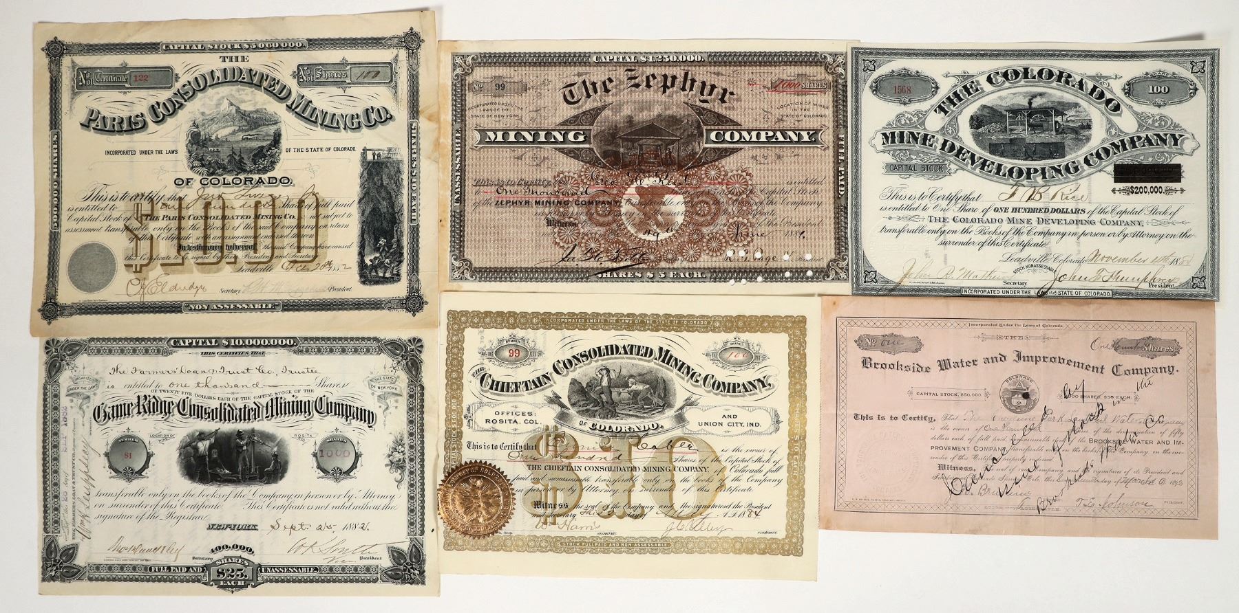 Lot of 6 different issued pieces. Includes: Brookside Water & Development Co. (1892, Colorado Springs); Game Ridge Cons. Mining Company (Rosita, 1882); Zephyr Mining Company (Monarch Mining District, 1881); Chieftain Cons. Mining Company (Rosita, 1884); Paris Consolidated Mining Co. (Leadville, 1882); and Colorado Mine Developing Co. (Leadville, 1880). Nice group! Please inspect.