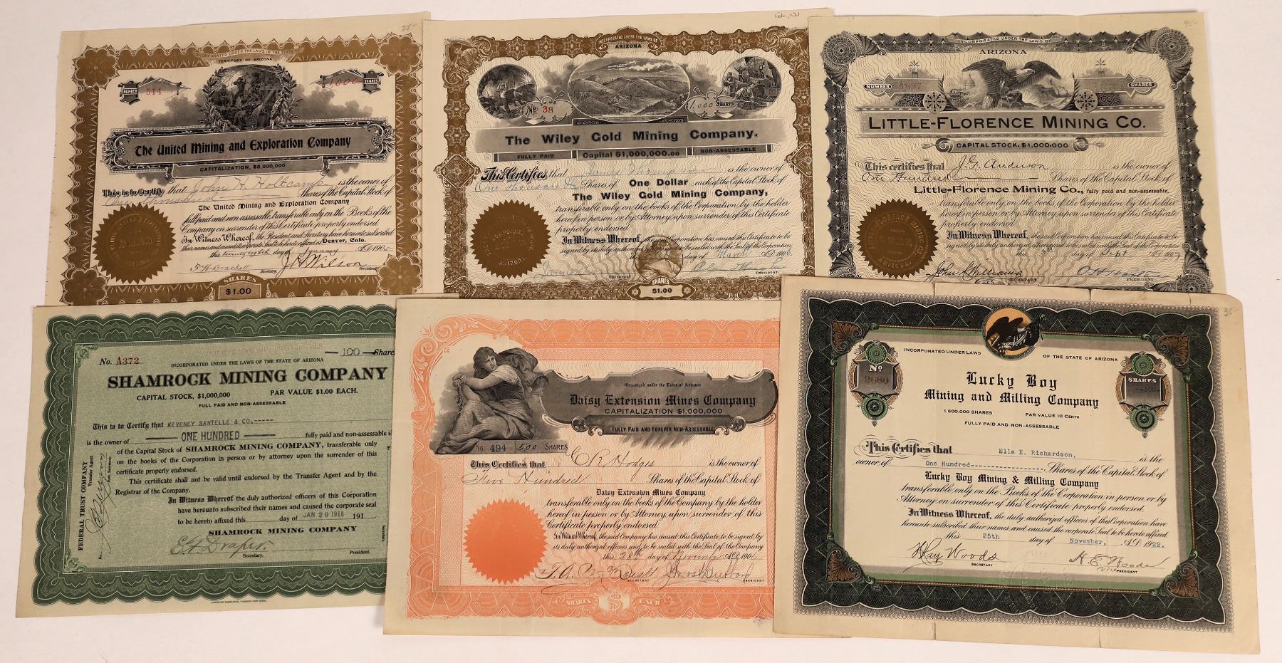 Lot of 6 different. Includes: Little-Florence Mining Co. (Goldfield, 1907); The Wiley Gold Mining Company (Lida, 1906); United Mining and Exploration Co. (Tonopah, 1905); Daisy Extension Mines Co. (Goldfield, 1906); Shamrock Mining Co. (1918); and Lucky Boy Mining and Milling Co. (1922). Please inspect.