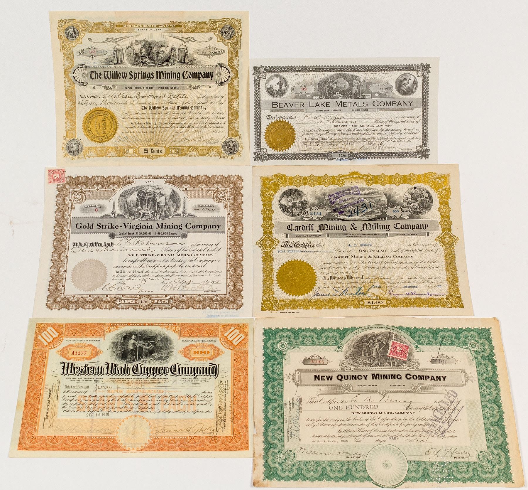 Lot of 6. Included: The Willow Springs Mining Company (1910, for 66,666 shares, not cancelled, multiple mining vignettes and ore buckets), New Quincy Mining Company (1929, punch cancelled, mining vignette), Cardiff Mining & Milling Company (1923, stamp cxl, 3 mining vignettes), Western Utah Copper Company (1918, not cxl, miner with drill vignette), Gold Strike-Virginia Mining Company (1915, not cxl, mining vignette), and Beaver Lake Metals Company (1916, 3 mining vignettes, not cxl). State: Utah City: HWAC#: 43009 Date: 1910-1929