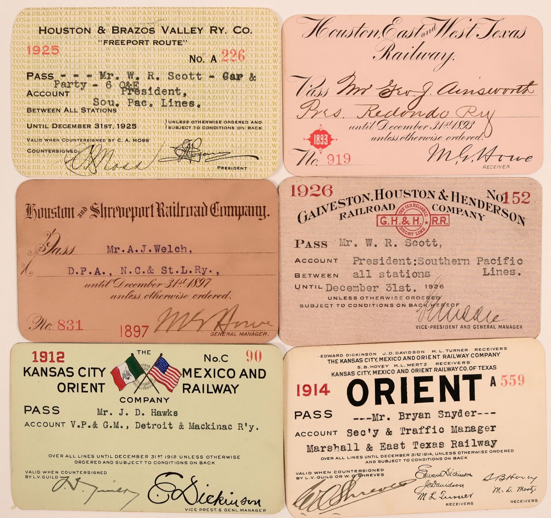 Lot of 6 different. 1) Houston & Shreveport Railroad Company. 1897. 2) Houston, East & West Texas Railway. 1893. 3) Kansas City, Mexico & Orient Railway. 1912. Two color flag vignettes. 4) Orient. 1914. 5) Houston & Brazos Valley Railway Co. Freeport Route. 1925. Issued to WR Scott, president of Southern Pacific. 6) Galveston, Houston & Henderson Railroad Company. 1926. Also issued to WR Scott. Nice group in very good condition!