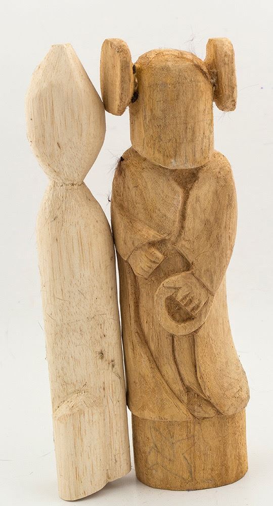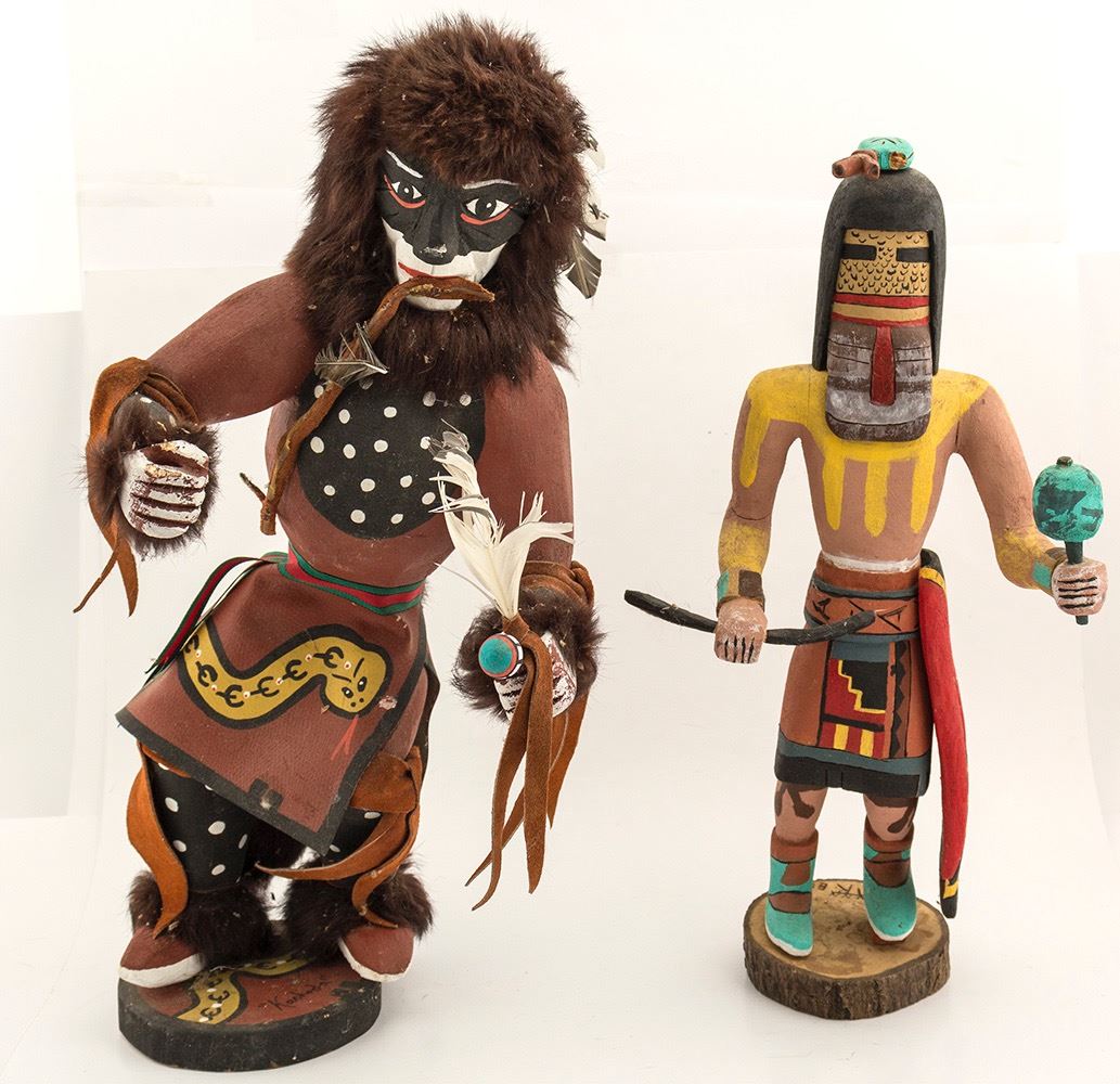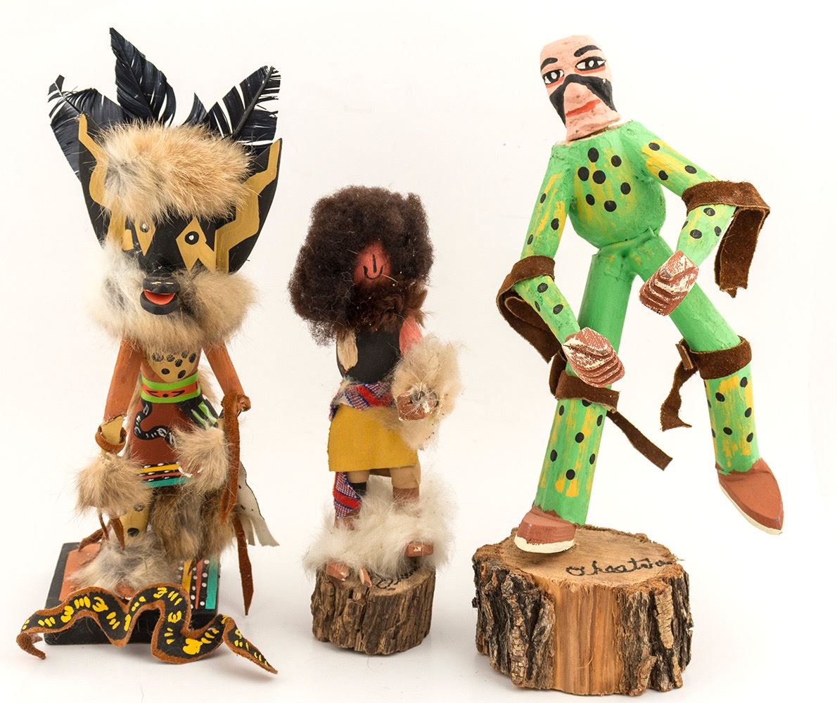 Six folk art "Kachinas", one is Snake Dancer (18" high; Ogre with bow and rattle (16" high); one dancer with bells, leg broken off; one green guy with huge fists (12.5"); Racer Snake, 11" high; buffalo dancer, 9" high. All somewhat damaged. Also included are two at carving stage. Date: Location: HWAC# 56864