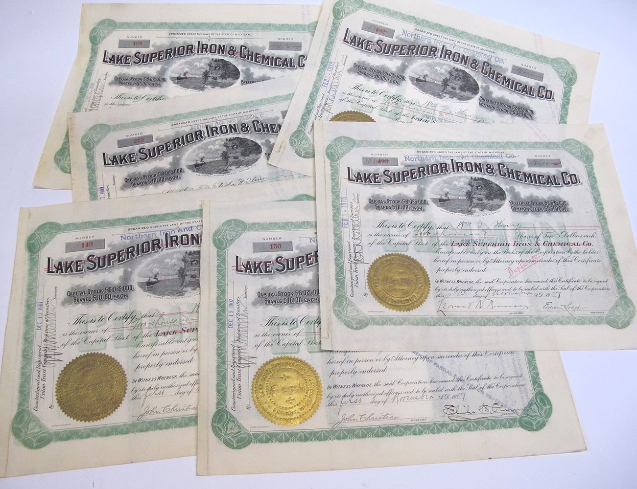 1) i/u issued to Taber 1907 #169 112 shares. 2)i/u to Wm. Sharp 1907 #157 2000 shares. 3) i/u to Wm. Sharp #151 2000 shares. 4) i/u to Wm. Sharp 1907 #150 2000 shares. 5) i/u to Wm. Sharp 1907 #149 2000 shares. 6) i/u t Elisha Flinn 1909 #279 320 shares. Date: Location: Michigan HWAC # 54629