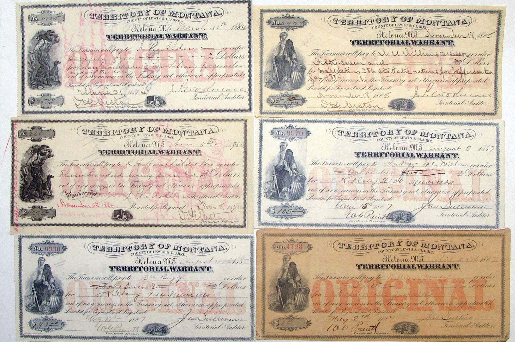 Lot of 6. Issued in Helena, M.T., 1880-1887. Issued for: collecting Jefferson County ballots; killing squirrels; librarian salary; and support of convicts. Two different forms: one shows a patriotic allegorical woman and the other has a vignette of a prospector and dog. Signed by the territorial auditor and/or treasurer. 4 x 9" Date: 1880-1887 Location: Helena, Montana HWAC# 66044