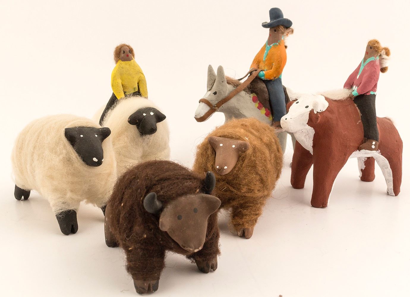 Six Navajo folk art ceramic animals. Four charming sheep wrapped in sheep fur, one with a rider. One horse with rider. One bull with rider. All about 4" long. Possibly by Elsie Benally. Great group! Date: Location: Navajo, Arizona/New Mexico HWAC # 49364