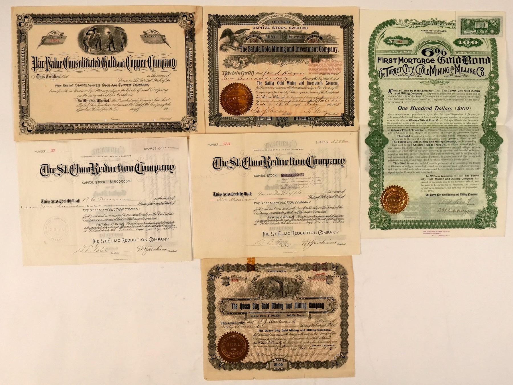 Lot of 6, most different. Included: Salida Gold Mining and Investment Company (1898); Par Value Consolidated Gold & Copper Co. (unissued); Turret City Gold Mining & Milling Co. $100 bond (1900); St. Elmo Reduction Company (1909 and 1910); and The Queen City Gold Mining and Milling Company (1903, mining vignette). Please inspect. State: Colorado City: Salida Date: 1898-1910