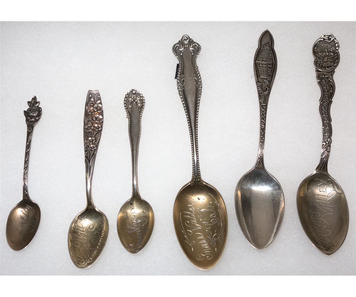 All different. Four of the spoons have gold wash on the bowls. Three are approx. 4" long, three are 5.5." One has the intials E.E.M. and 925/1000. One marked Pat'd 89.