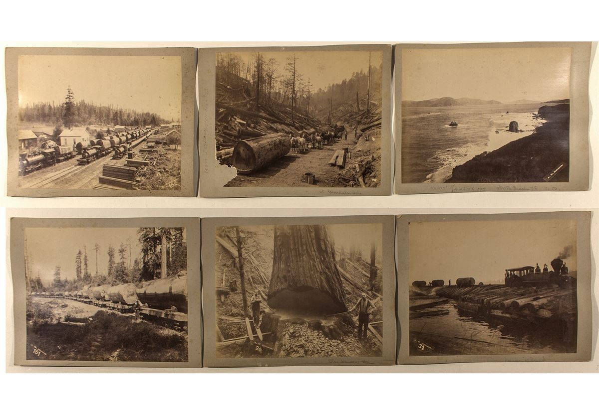 Photographer is A.W. Ericson. According to Mautz, Ericson (1844-1927) moved to Trinidad in 1869 and worked in the lumbering business till 1876. He started a photography business with his brother in Arcata and was active from 1895-1925. Three 8.75" x 11" pages, six photographs (7.75" x 9.5") total (one front and back). Includes: 1) No. 151. Excelsior Redwood Co. Eureka, Cal. Shows 15 train cars with very redwood logs on them and a few men posing. Contrast medium. Reverse side has No. 152. Same company. This view shows three locomotives with cars and redwood logs in tow. Medium contrast. 2) No. 31. Logging at Bayside. Shows logs being rolled down into water for transport off of locomotive. Splash visible! Reverse is No. 50. Labeled as Ericson. Shows coastline. Labeled "North Beach S.F." 3) Last two may be the best: No. 26. Two loggers with axes posing next to a redwood that has been cut thru, but not fallen yet. Pencil notations indicate "Oley Hanson Claim." Reverse is No. 130. Labelled in pencil, "at Glendale, Cala." Shows teams of horses pulling redwood logs up dirt rood. Many fallen trees on either side. Fantastic! Missing bottom left corner. Condition: all the photographs have medium contrast with little to some soiling. Very nice set from this photographer who was documenting the industry he had left in the 1870s!