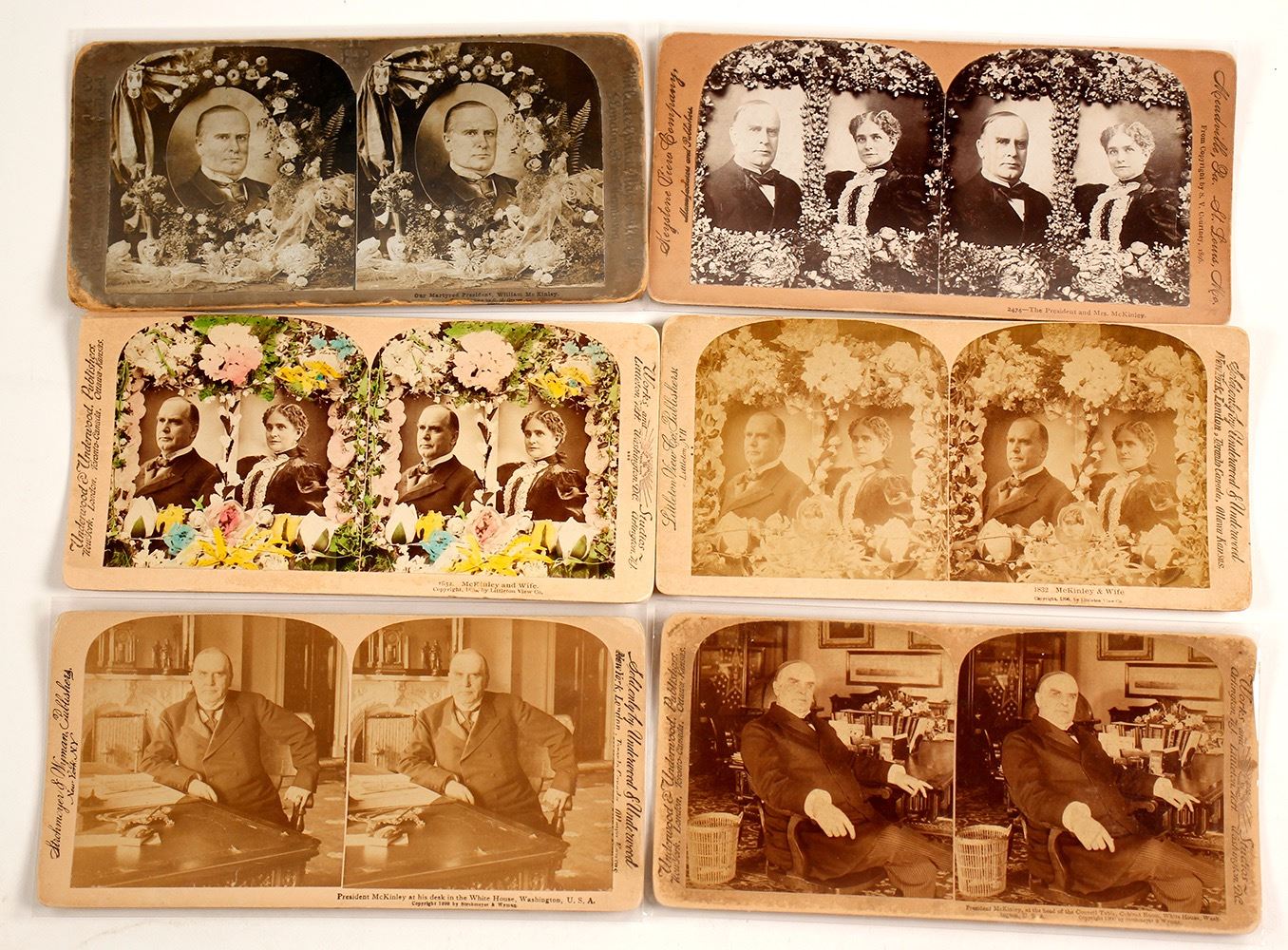 Lot of 6 different of the 25th president. Four Underwood & Underwood: two of McKinley at desk in White House, c.1898 and c.1900, and two portrait style showing McKinley and his wife, one hand-colored, c.1890s. One Keystone view 2474 of the President and Mrs. McKinley. And one Universal Photo Art Co. portrait entitled "Our Martyred President." McKinley was shot at the 1901 Pan. American Exposition in Buffalo, New York and died from his wounds 8 days later. He had just begun his second term. (Prag Collection) Date: Location: HWAC# 54791