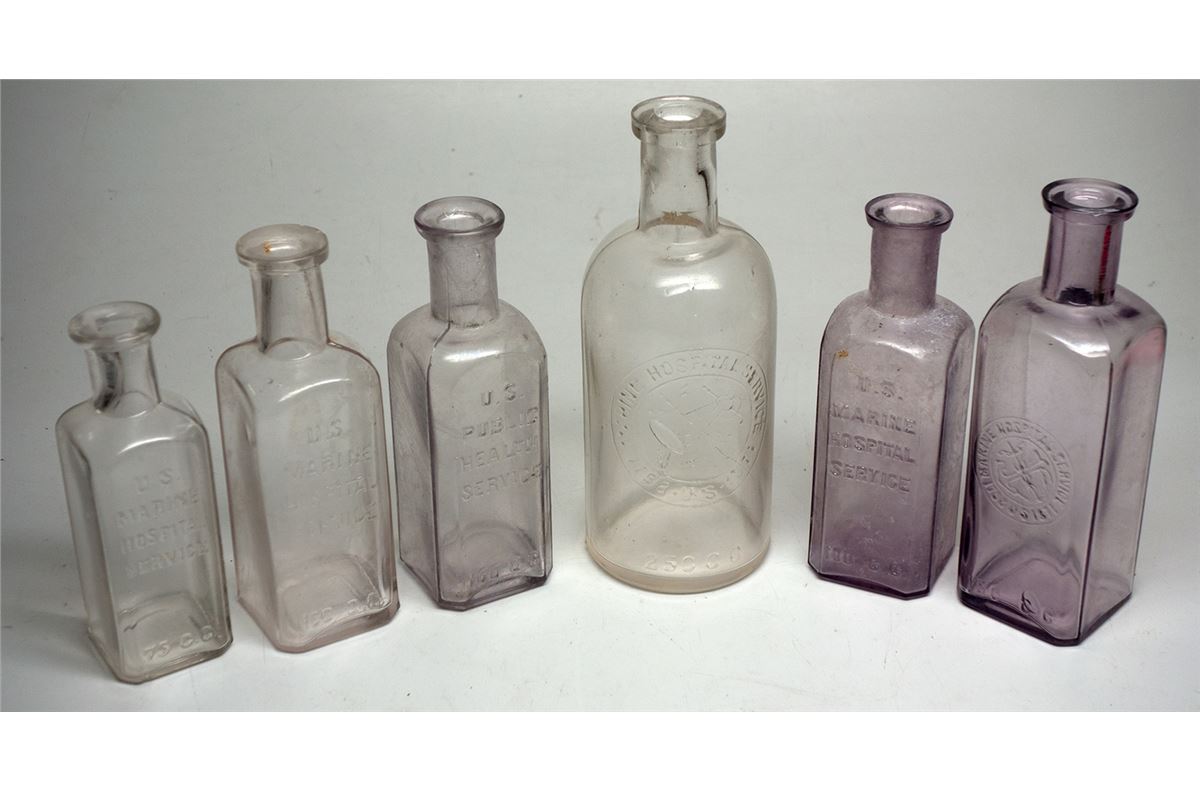 Includes a rare 150 c.c. bottle in very good condition. Two different embossed patterns.