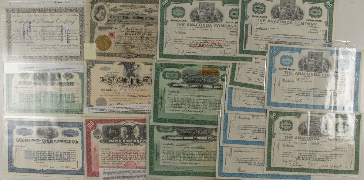 Lot includes 10 The Anaconda Company stocks: Amaconda Copper Mining Company, 2-1934, both stamped in orange from Amsterdam; 1 from 1958, punch cancelled; 2 from 1967, both punch cancelled; 4 from 1969, all cancelled; 1 from 1970, punch cancelled. Montana Bay State Mining Company, no. 54, 100 shares, 1892; Cleveland Mining Company, no. 707, 1000 shares, 1890, cancelled; Davis-Daly Copper Company, no., B2555, 100 shares, 1909, cancelled; Timber Butte Milling Company, no. 10, 1 share, 1925, cancelled; more. City: Butte State: Montana Date: ID: 36224