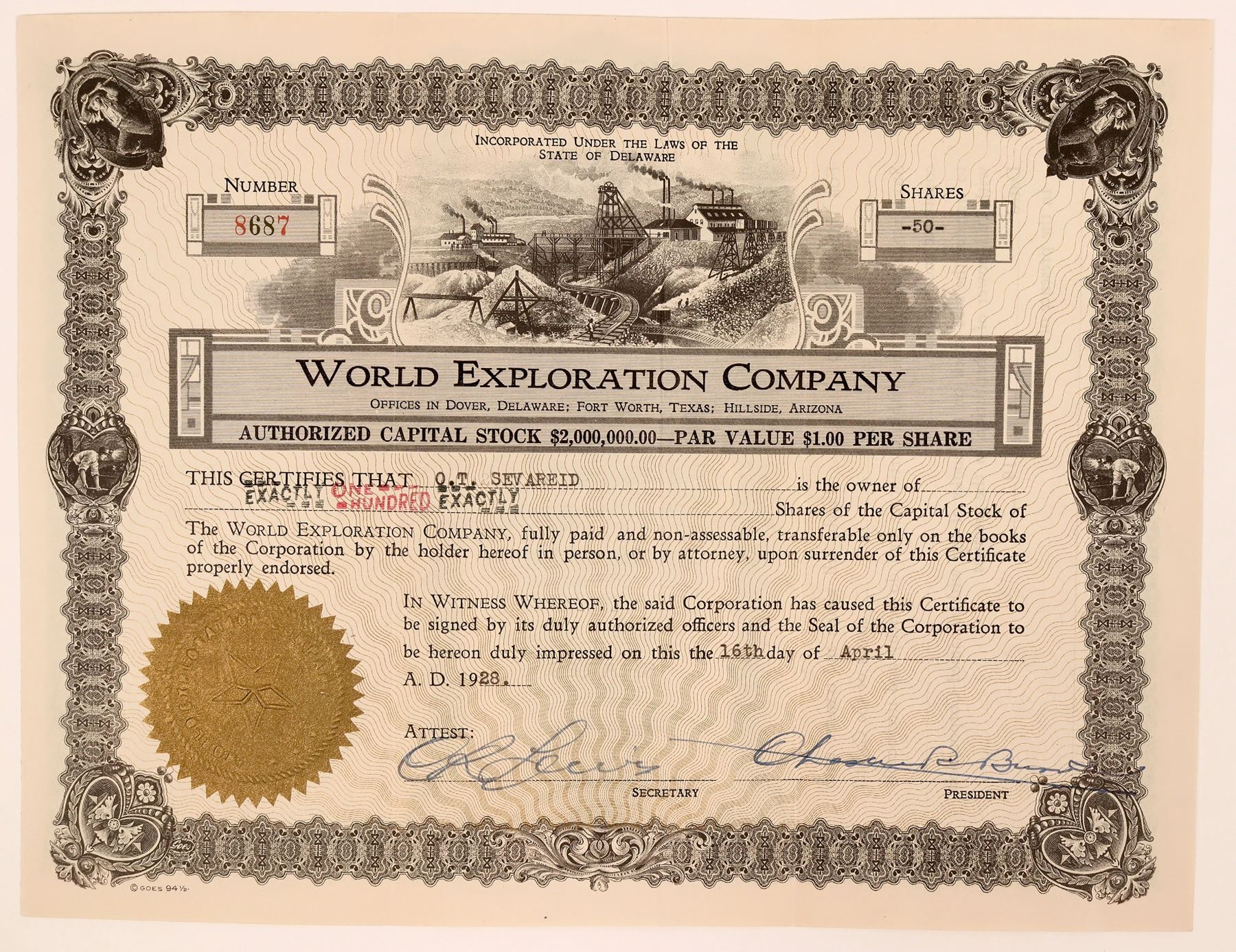 A great story in Lingenfelter's "Death Valley and the Amargosa", Lingenfelter tells the tale of Chester R. Bunker, extreme mining promoter and ultimate flim-flam man. Bunker's World Exploration Company bought a mine in the Last Chance range from Sol Camp, noted mining man and Goldfield stock broker. Camp discovered gold at Skookum in 1924, but lost interest in it. The mine was located 10 miles south of Sand Springs. Bunker paid $100,000 for controlling interest in the mine (Lingenfelter). Bunker ran full page ads touting Skookum as "The Hope of the West for the mine of the Century!". Our World Exploration Company stock certificate was issued in 1928 and signed by Bunker as president. Millsite mining vignette at center with tiny mining vignettes around the perimeter. The certificate is in very good, uncancelled condition. A nice Death Valley piece.