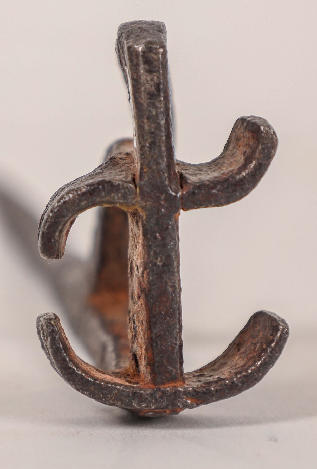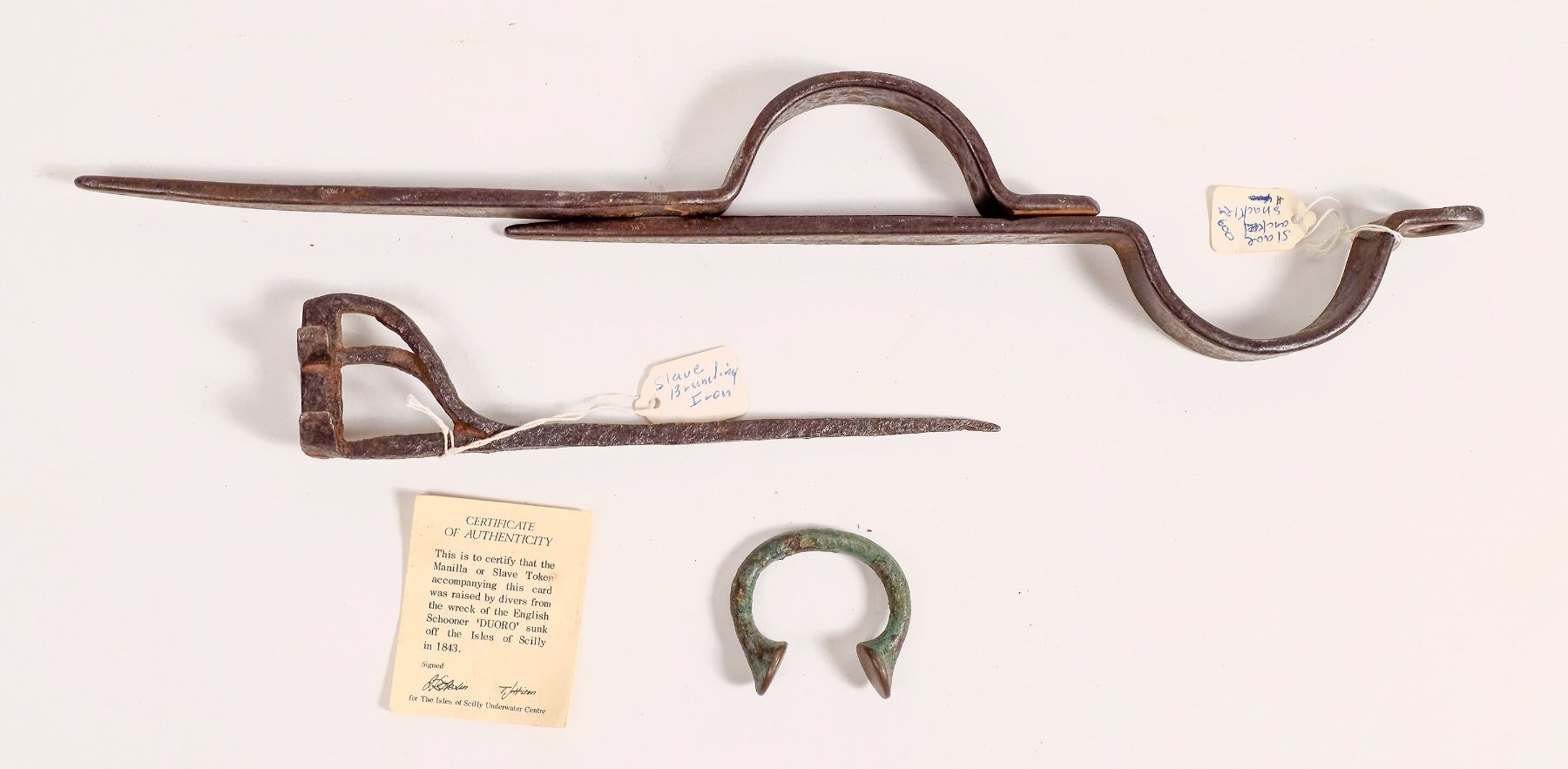 Three slave items including an ankle shackle and branding iron. It is unknown if these are originals or reproductions. The other item is a Manilla or Slave Token. This item was a form of currency that was used in the slave trade. This particular Manilla was raised from the shipwreck of the English Schooner "Duoro" that sunk in 1843. It is accompanied by a certificate of authenticity.