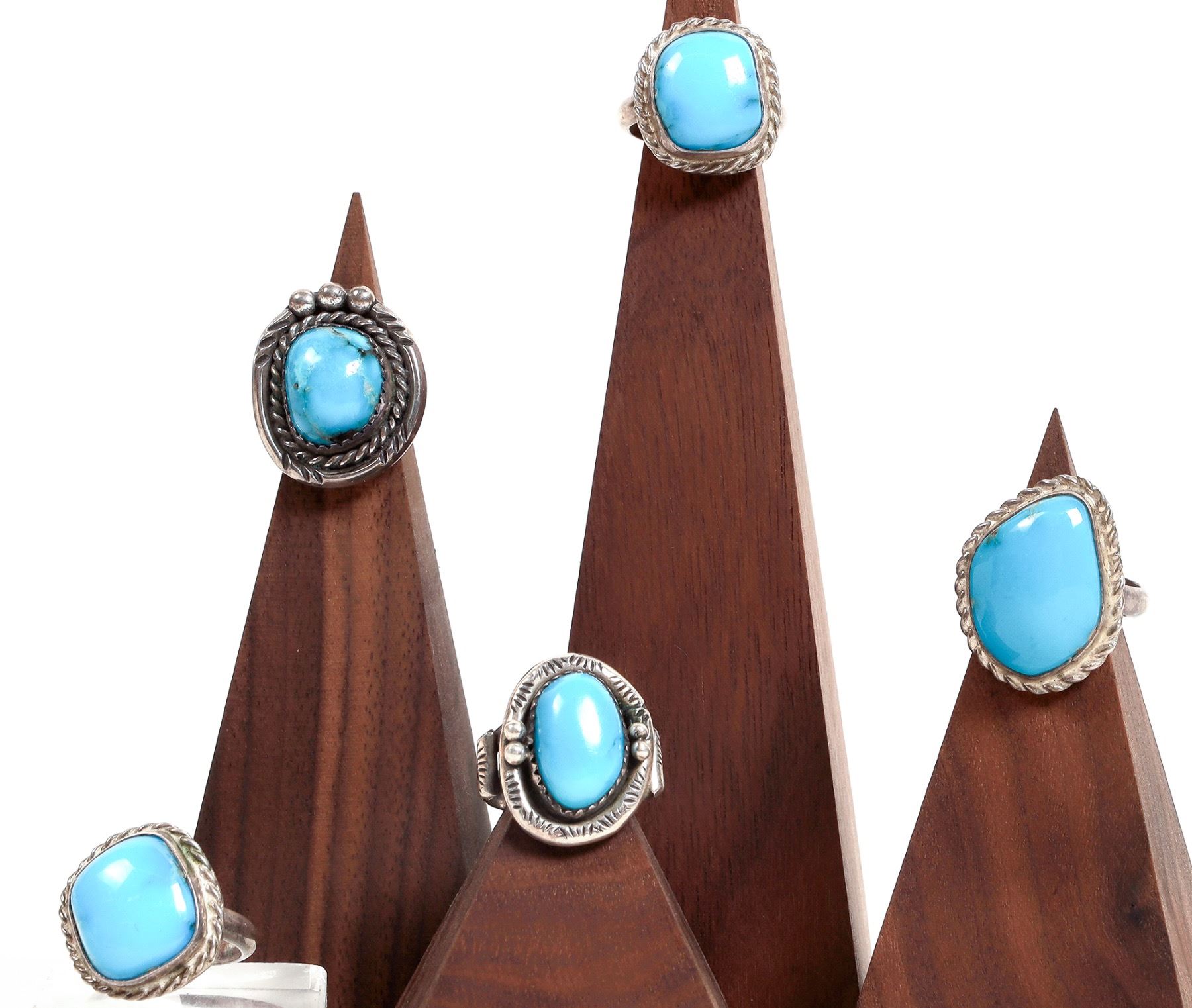 Five turquoise and silver rings. One labeled 1947 Zuni. Ring sizes as pictured from left to right: 5, 4.5, 6, 5.5, 5.25 [] [] [] [] []