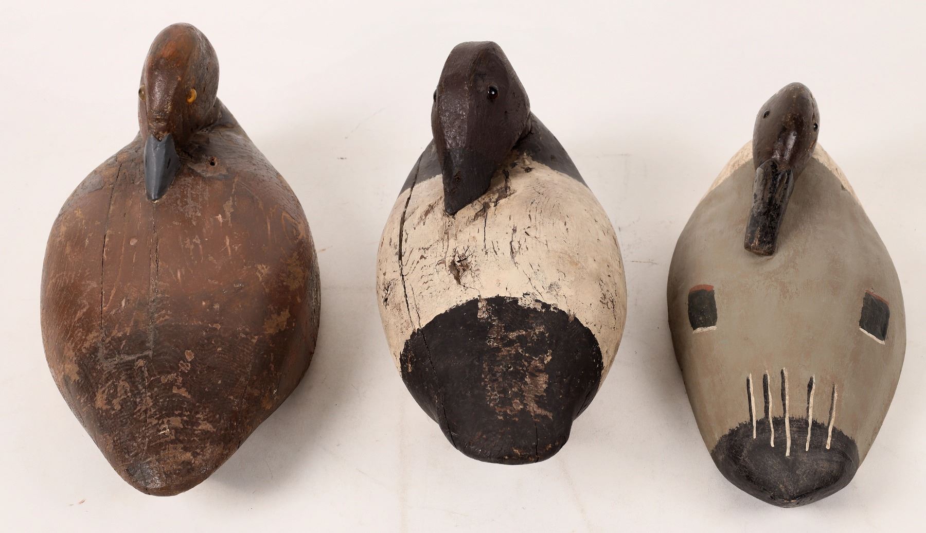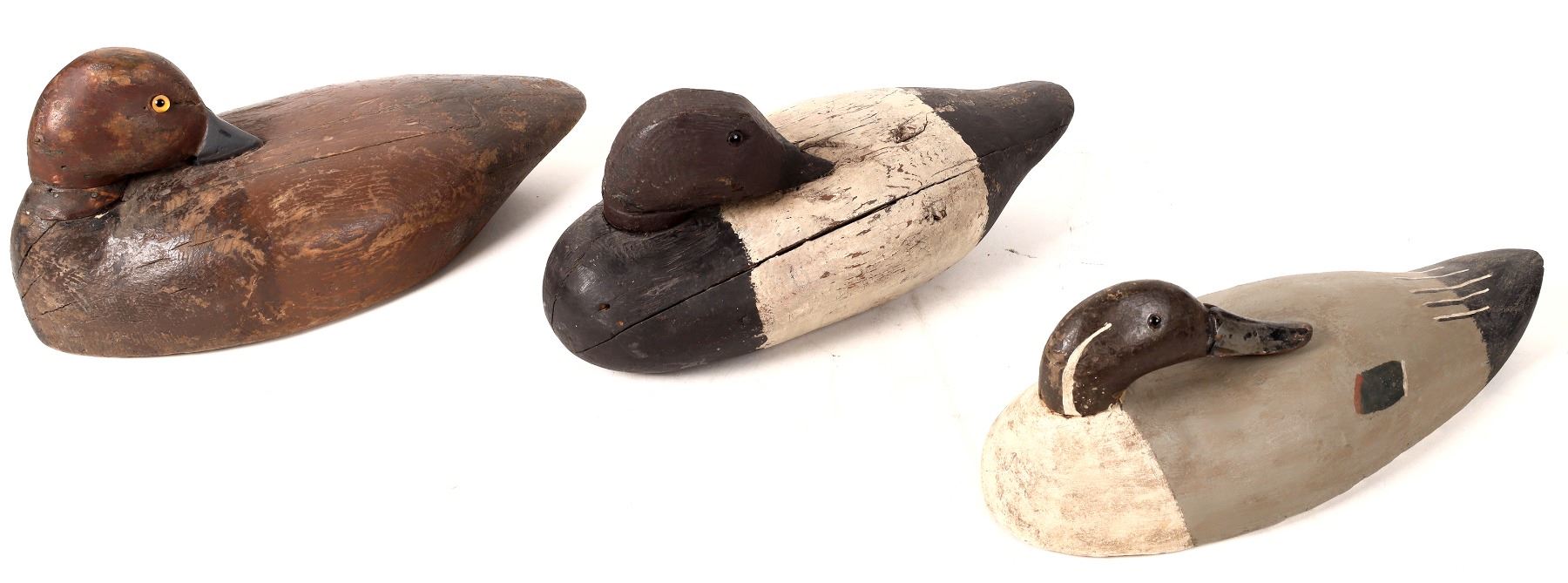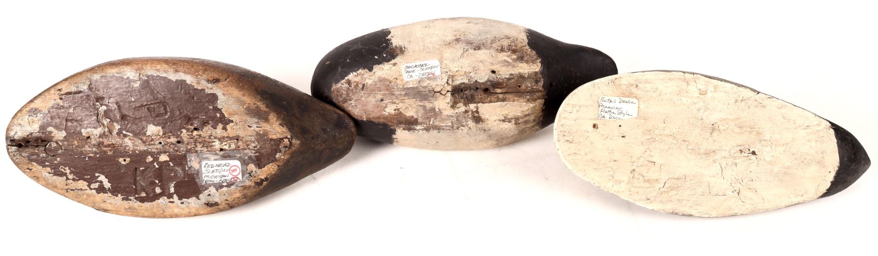 3 sleeping drake wood duck decoys. Black/white canvasback drake, 5.5x12x5.25", horizontal crack, paint loss, neck separation, bottom screw holes, unmarked. Pintail drake, preener, flattie style, California origin, unmarked 4.5x12x5.25". Red head sleeper, Michigan origin, branded K P onbase. 6x12.5x6". Some cracks, neck has small nail, top has hole. Please inspect. Gary Bracken Collection