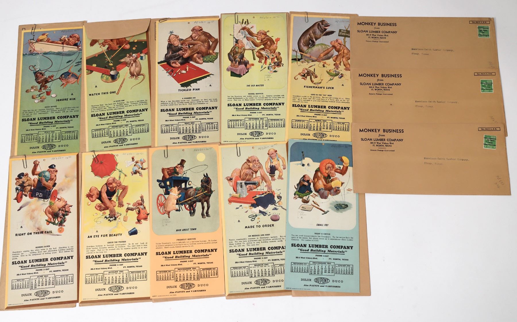 10 1941 Sloan Lumber, Monkey Business, advertising calendars with 12 envelopes. Monkeys in all scenes. 10x4.75".