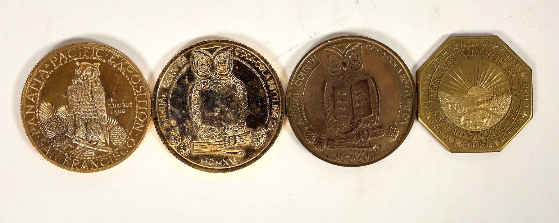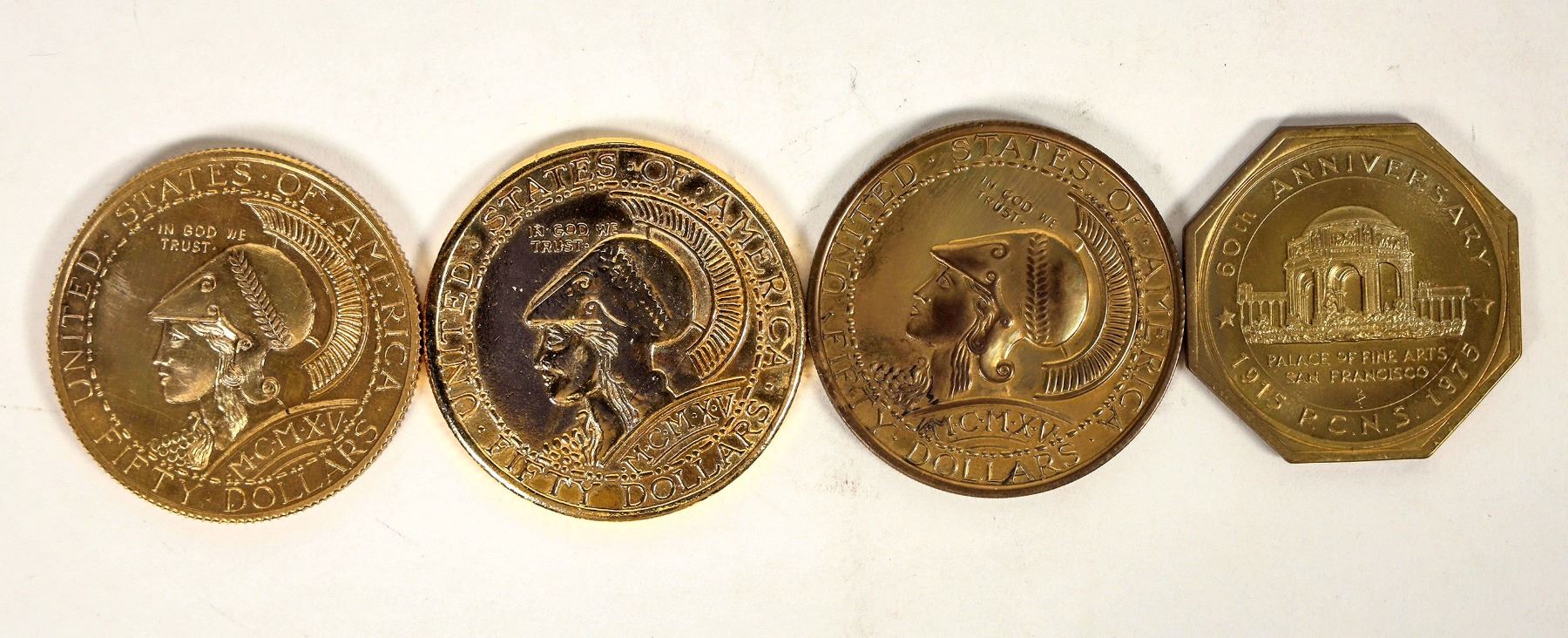 Lot of four restrikes from the 1970s: 1) Panama Pacific International Exposition; San Francisco 1915; 45 mm; (with envelope from Bill Weber); BU condition; Obv.: Bust of Minerva/Athena facing left; United States of America / Fifty Dollars / In God We Trust / MCMXV; Rev.: Owl perched on pinecones; Panama-Pacific Exposition / San Francisco / E Pluribus Unum. Designed by Robert Aitken, made at U. S. Mint San Francisco. 2) 1915 Coca Cola Annual Convention $50 slug; 45 mm (with envelope from Bill Weber); BU condition; 3) 1975 60th Anniversary of the Palace of Fine Arts; Pacific Coast Numismatic Society; brass, octagonal, 40 mm; 4) 1915 Coca Cola Annual Convention $50 slug; EF-AU condition; 45 mm. See "Slug Imitations" by Mike Locke online for more information.