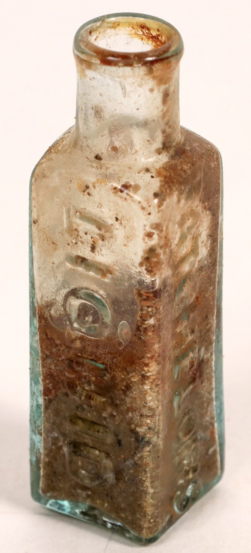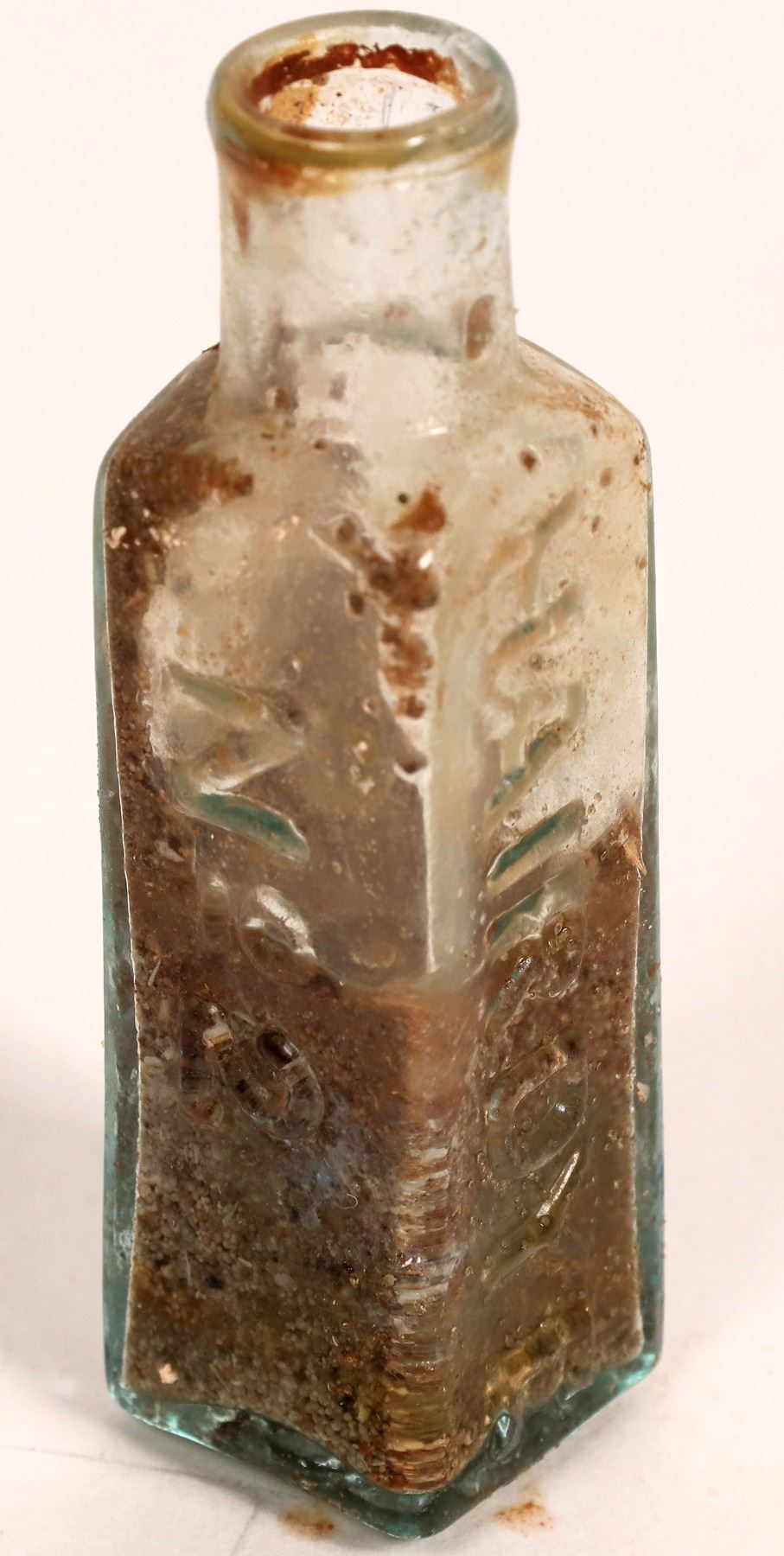 This small bottle is 2-3/4 in. long with an open pontil, aqua in color now filled with ocean sediment. Batchelor's Liquid Hair Dye No. 2.