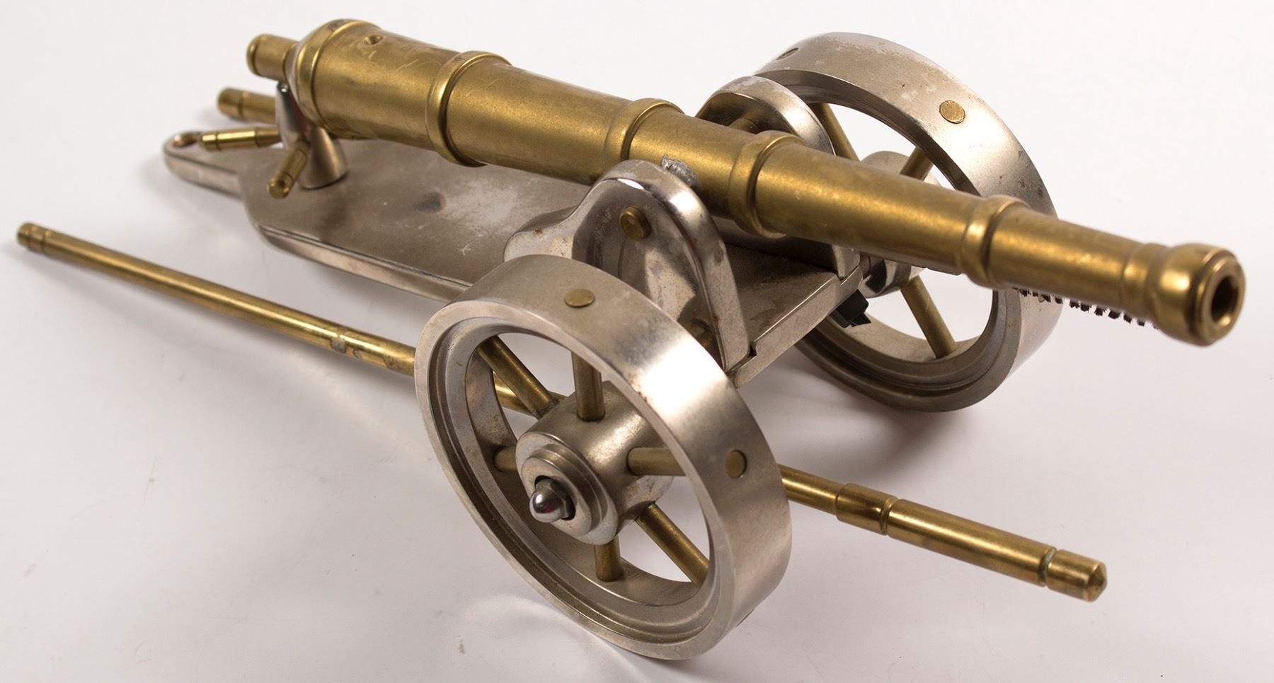 This is a small cannon, suitable for a desk ornament, or...? Overall,the carriage measures 15" with the actual cannon coming in at 12 3/4" . It appears to have been fired, but that is an optioned left solely to the buyer, with Holabird Americana bearing no responsibility. Piece comes with bore cleaner and ram rod. Polish her up and she'll look as good as new. Date: Location: HWAC# 56650