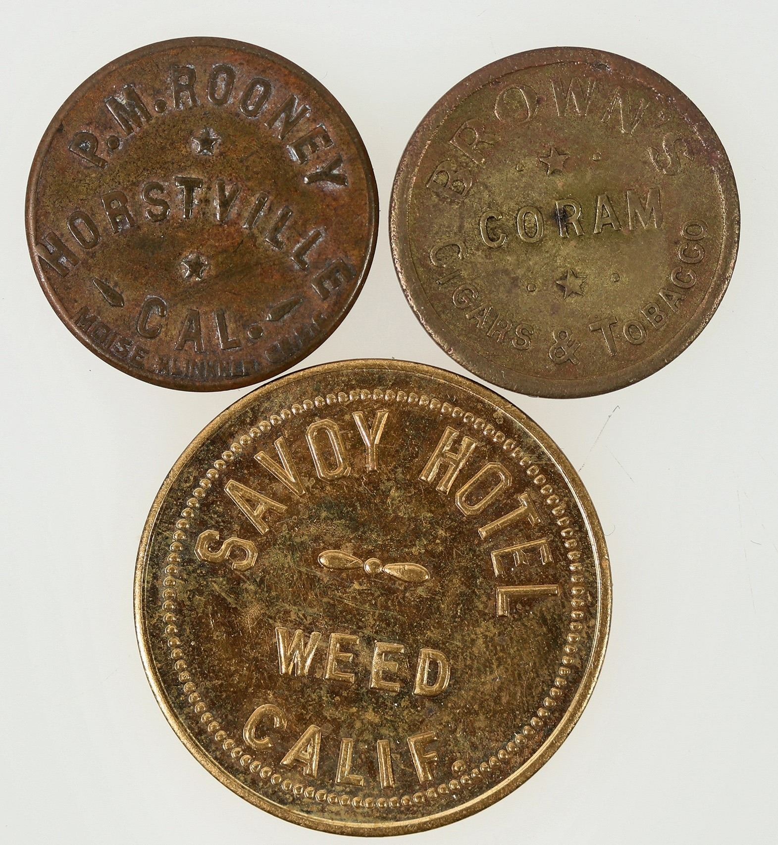 Three tokens from small California towns: 1) Savoy Hotel, Weed; 2) Brown's Cigars & Tobacco, Coram; 3) P. M. Rooney, Horstville.