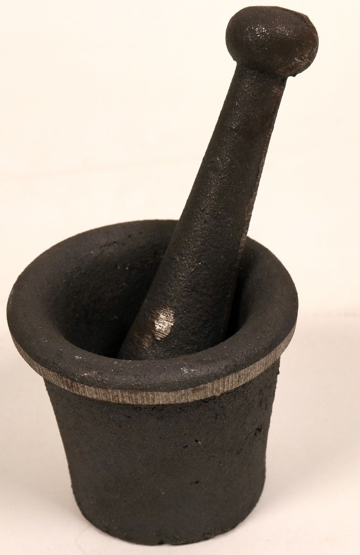 Usable cast iron mortar & pestle reproduction. Mortar is 3.5 inches high, 3.5 inches diameter. Pestle is 6 inches long.