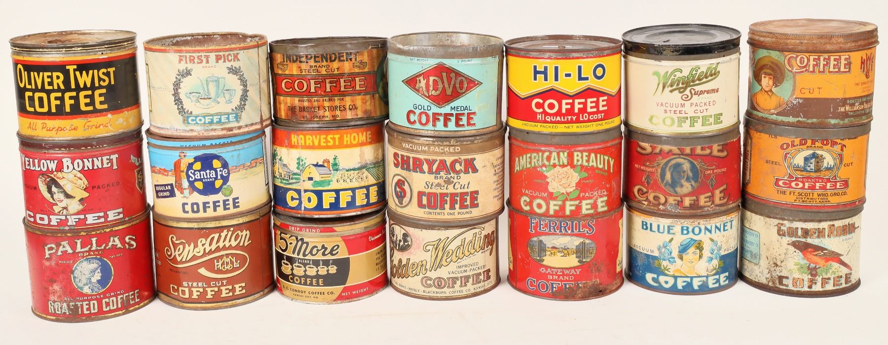 21 different small coffee tins, about 4". Ferrils, Blue Bonnet, Shryack, Hi-Lo, Harvest Home, Pallas, First Pick etc. See photo. Gary Bracken Collection