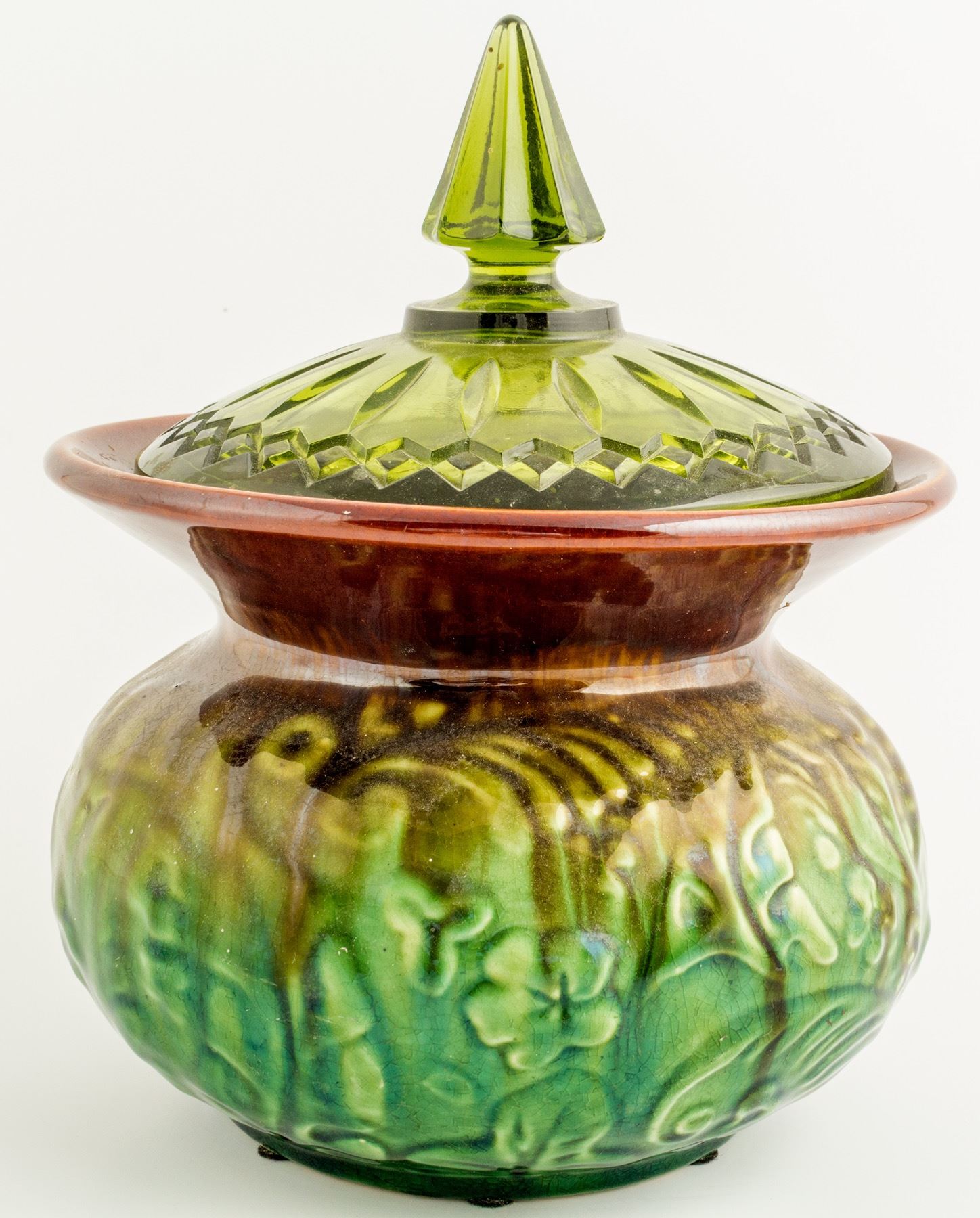 Nice decorative piece. Green and brown majolica. Glass lid is not original. 5.5" tall. Is 'Dainty Spittoon' an oxymoron? State: City: HWAC#: 48444 Date:
