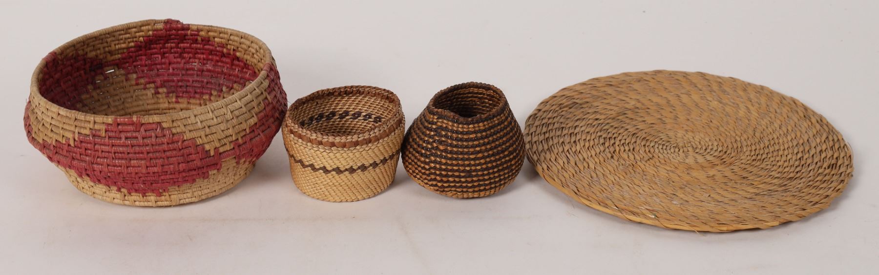 3 small Native American baskets. Spruce root Hoopa with maidenhair fern and possibly bear grass, 1.75x2.5". 3 tone, Nooka, Washington origin, 1.5x2.5". Navajo school Raffia sewing material with red dyed Raffia, 2.5x5". Woven Mexican plate 7".
