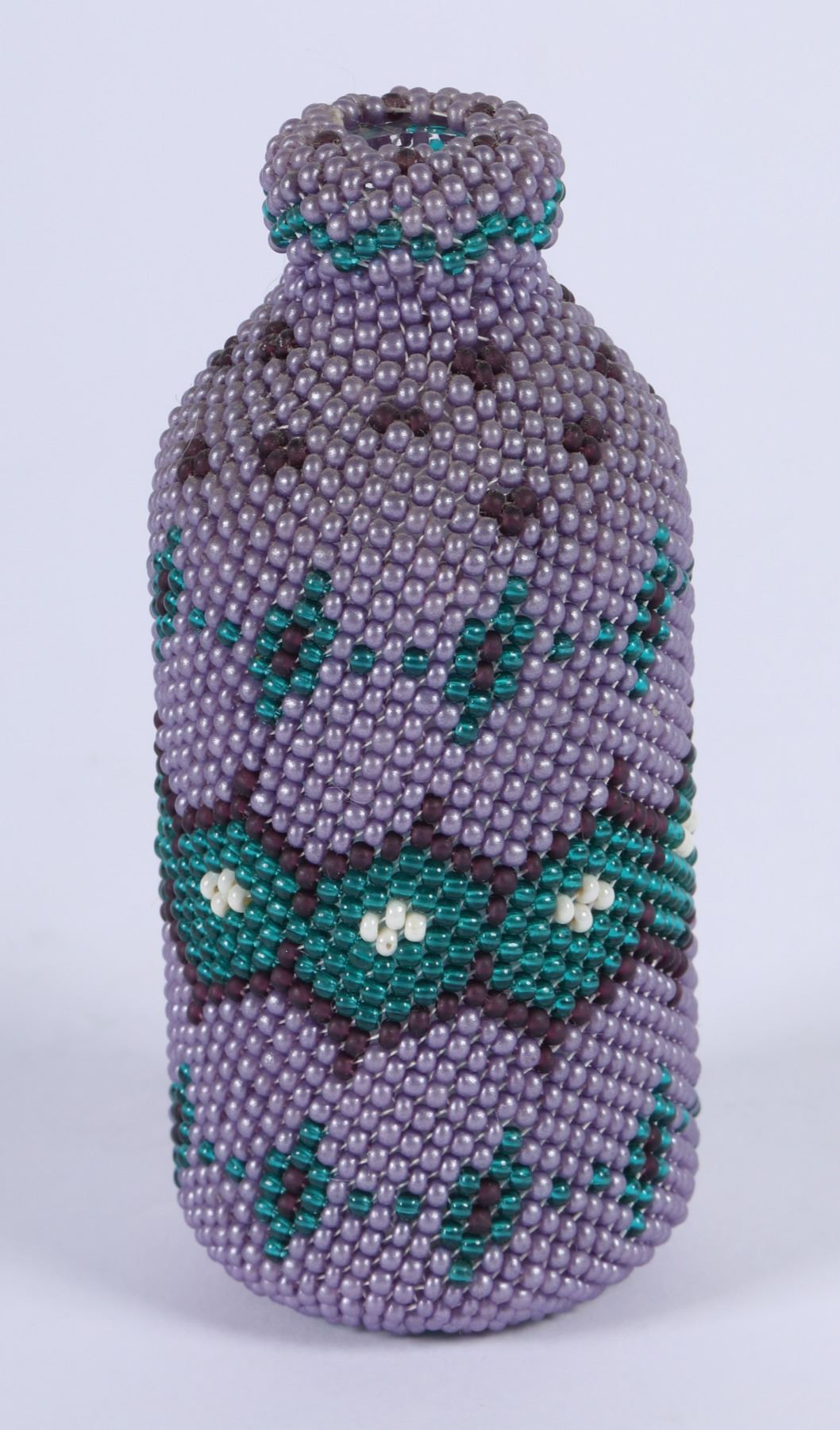 Gorgeous contemporary small beaded bottle. Not a bead amiss! 3.5" purple, turquoise, white, lavender beads. Paper scroll inside bottle.
