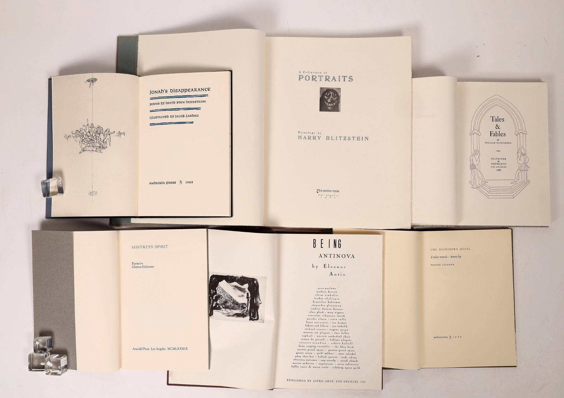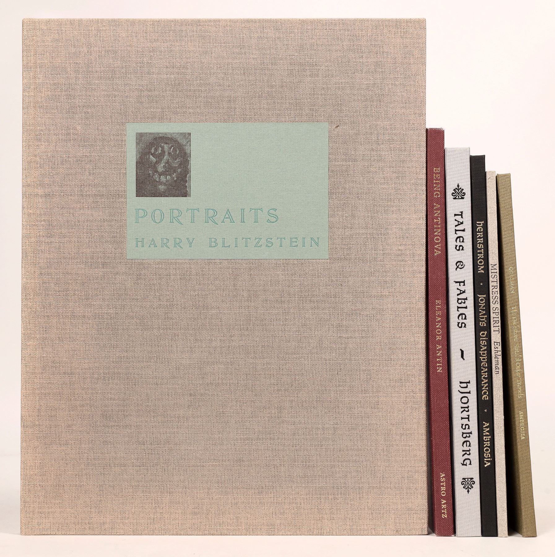 Jonah's Disappearance by Herrstrom-Ambrosia Press, The Dicksboro Hotel & Other Travels by Coleman-Ambrosia Press, Mistress Spirit by Eshleman-1989 Arundel Press, Tales & Fables by Hjortsberg-Slyvester & Orphanos, edition of 330 copies, Portraits by Blitzsteing-1983 Tea Garden Press. Being Antinova by ElanorAntin.All mostly fine condition.