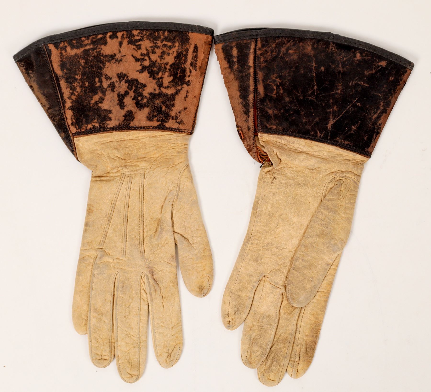 Pair of small, perhaps ladies size, 2 tone leather gauntlets. 11.75" long. Left glove has cuff seam separation.
