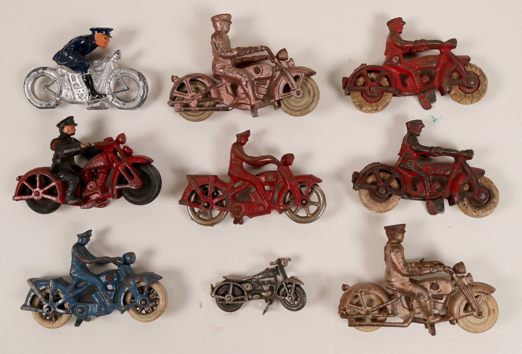 10 metal smaller sized motorcycles. Lead Barclay, white metal Barclay, 2 cast iron red Cop and 6 assorted. 2.75-4" long.