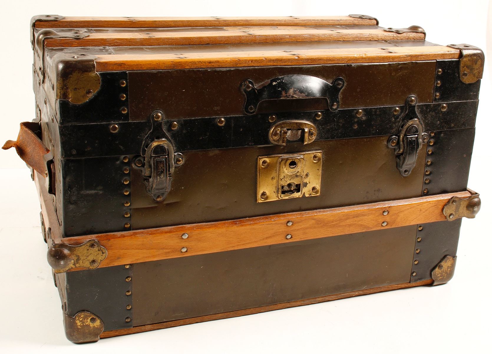 Small size steamer trunk, high-quality. Reinforced oak staves around the center on the top and on the bottom. Express labels applied on two sides, Railway Express, Long Beach to Oregon. 11.5" tall 12"deep 19.5"wide. This case was designed to carry something very important and probably heavy. The level of reinforcement is astounding. The front clasp and the main front latch is missing. Date: Location: HWAC# 64455