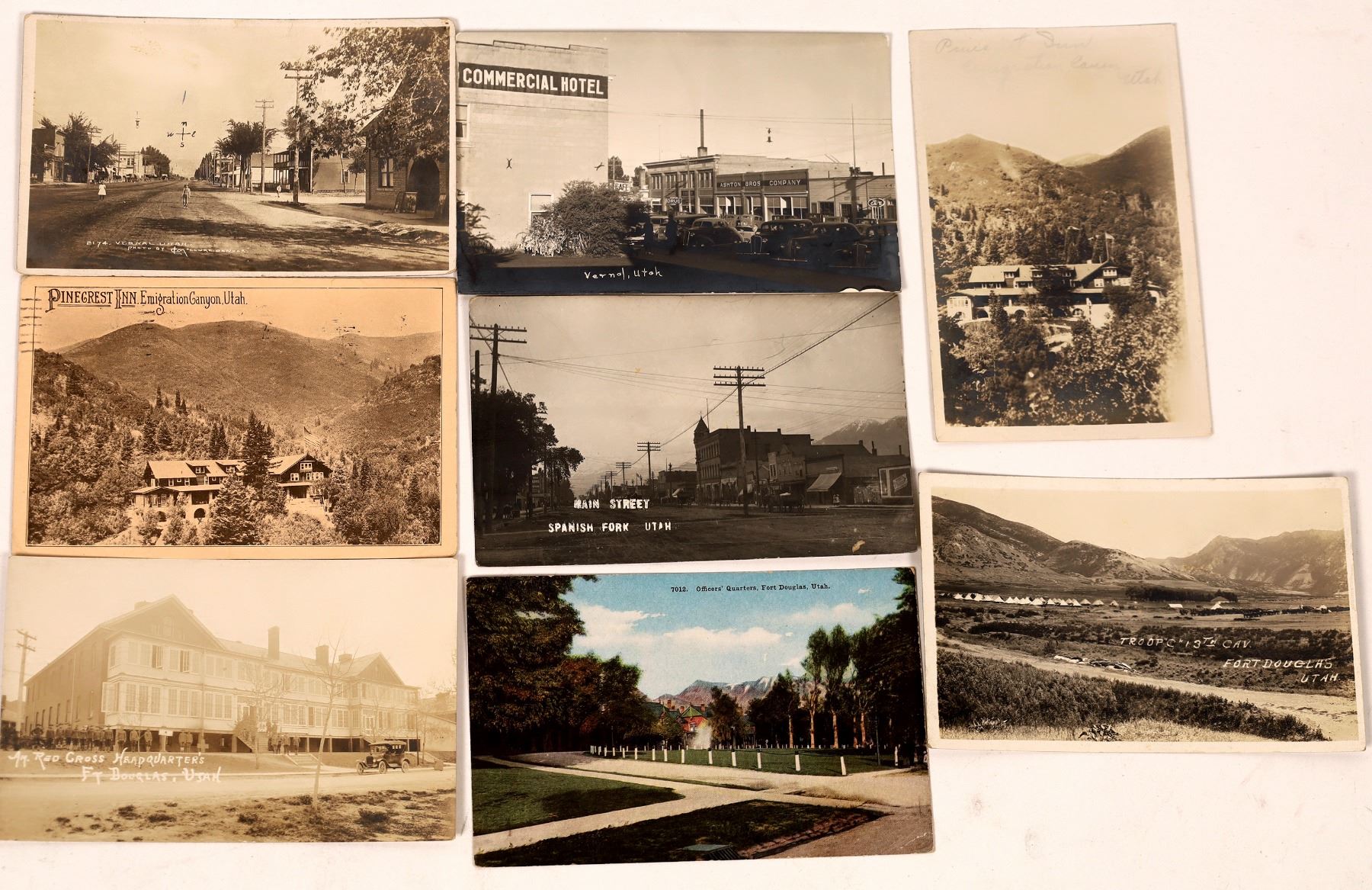 Vintage scenes from small towns in Utah: Fort Douglas, Vernal, Spanish Fork, Pinecrest. Eight cards total, all but one black and white RPCs.
