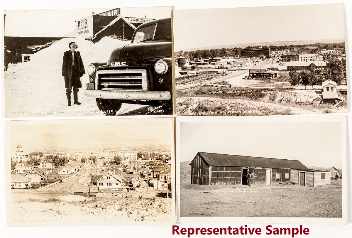 Lot of 15 early Postcards from small towns in Wyoming: Riverton, Hanna, Casper, Douglas, Basin, Sinclair, Dubois, Sundance, Green River, Newcastle, Cheyenne, Rock Springs, Rawlins, and snow drifts at the Piker Springs Service Station on U.S. Hwy 30. City: State: Wyoming Date: ID# 44606