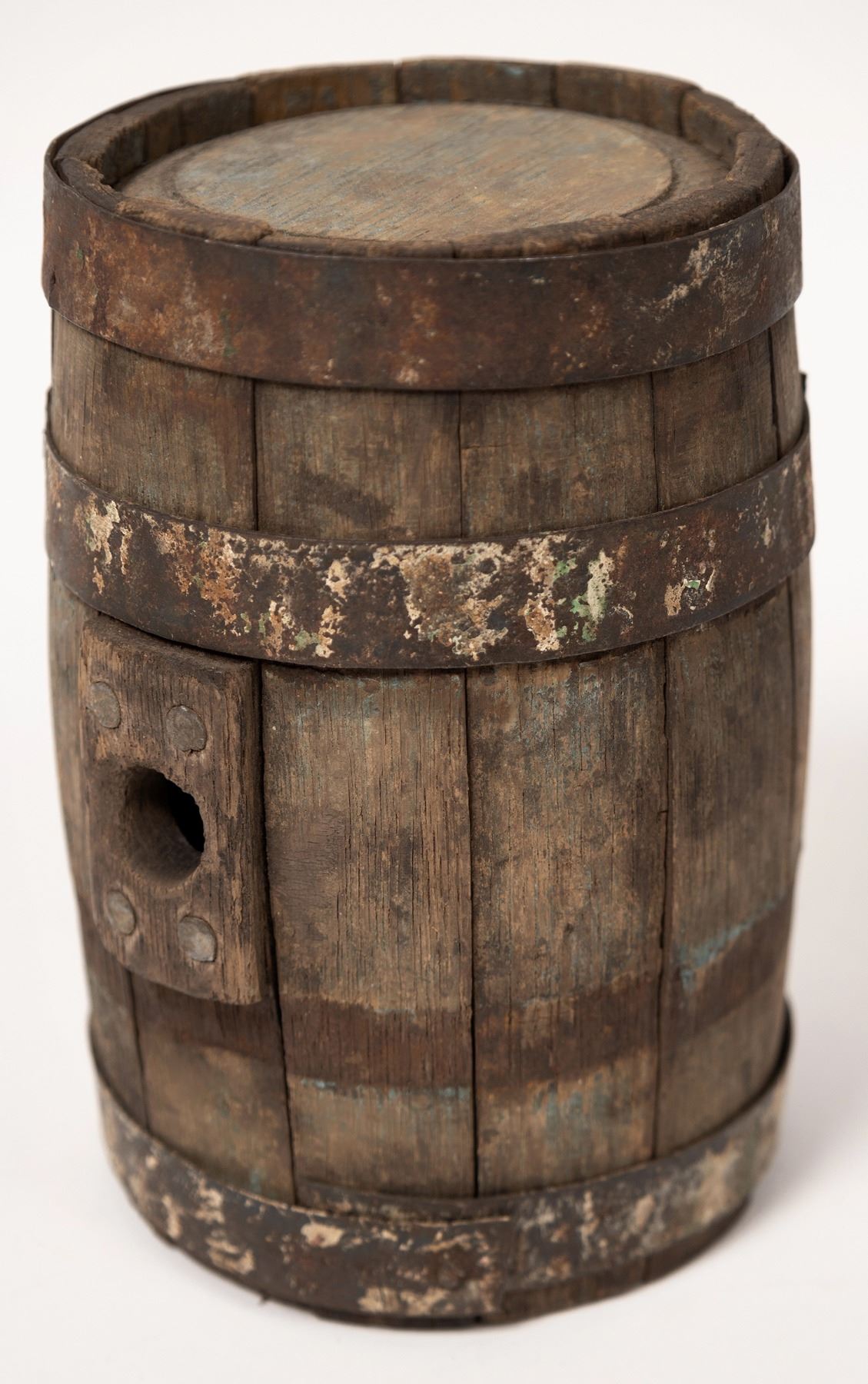 Cute little wood cask. Purpose unknown. 6x4.25". Original paint mostly gone. Missing bung and 1 hoop.