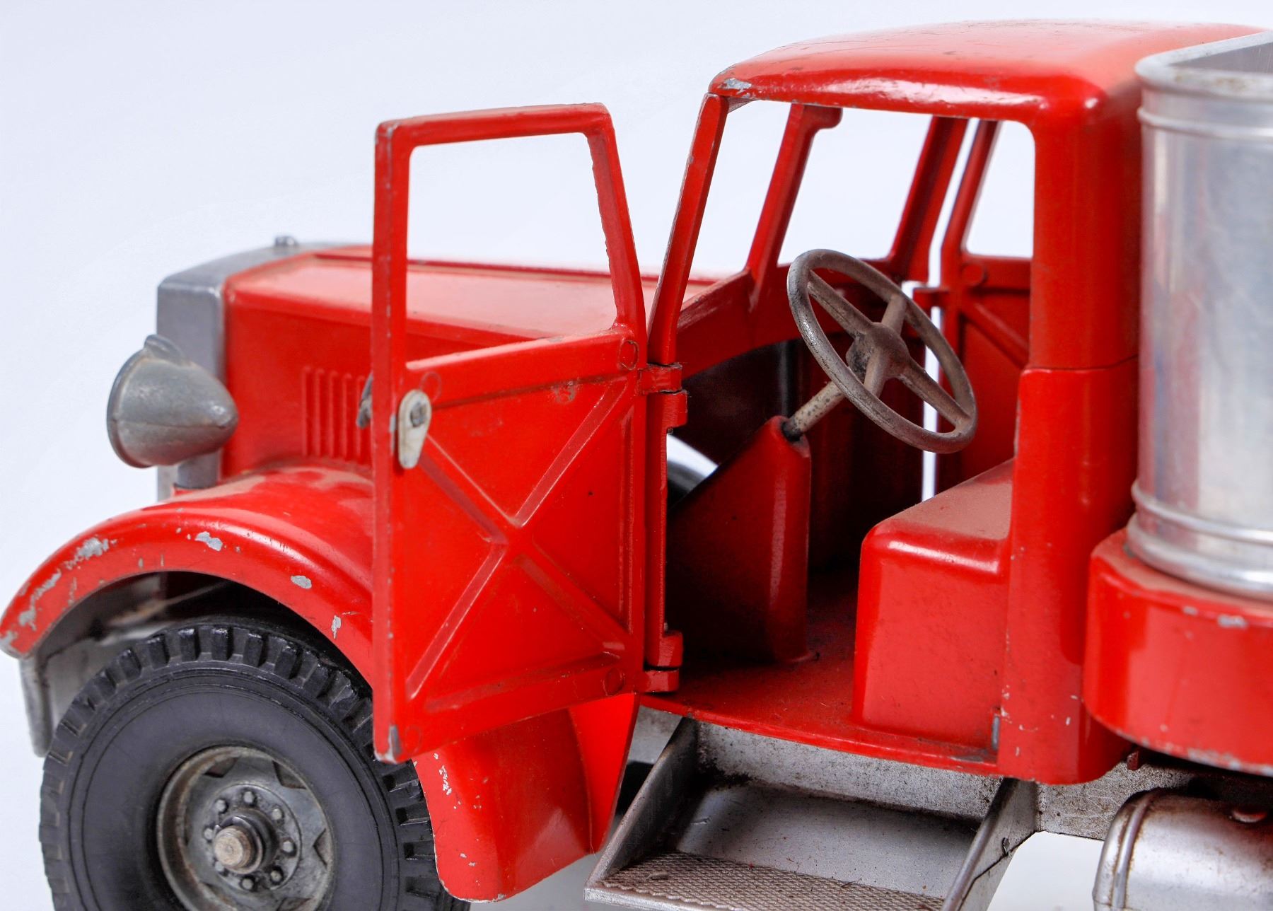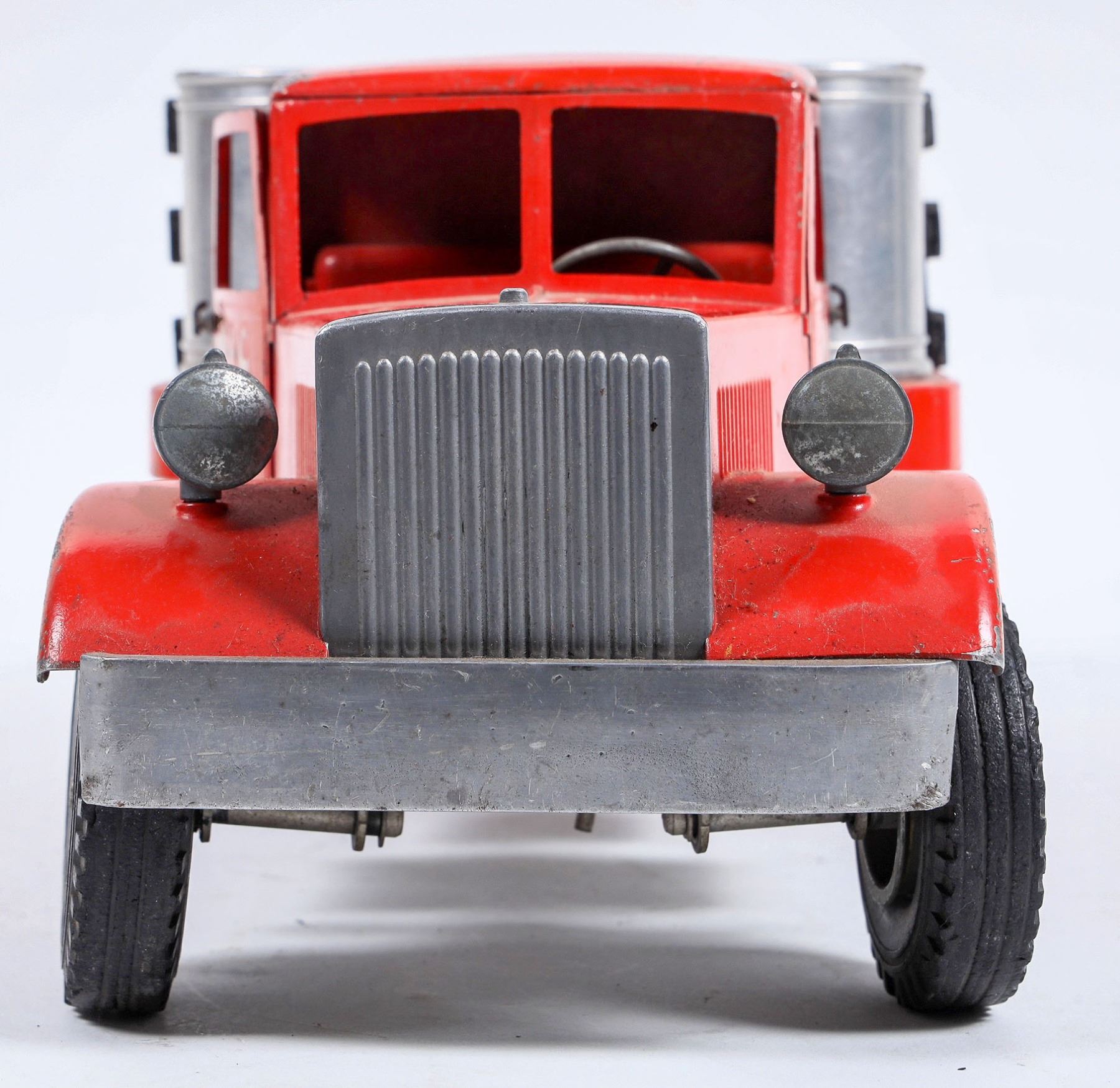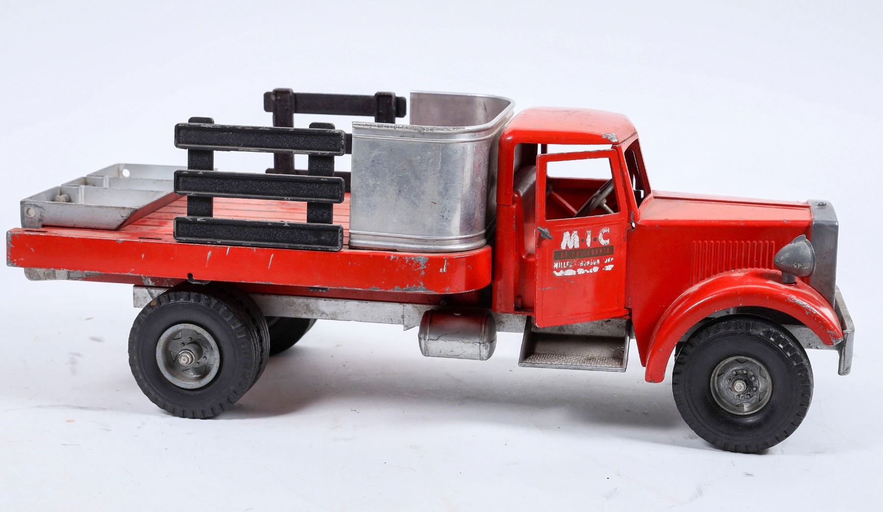 Smith Miller California Miller Ironson Corp ( MIC ) Delivery Truck , Die Cast, circa 1954. Red/Silver, in Excellent Condition, Doors, Lift Gate, Steering wheel turn wheels. Great Addition for Collectors. 18"L, 15 LBS.