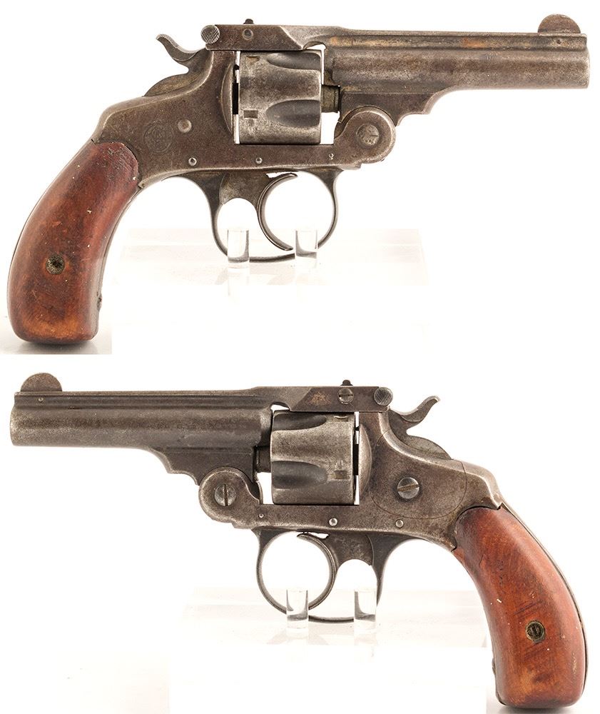 This Smith & Wesson .32 cal. center-fire revolver is a 5 shot double action/single action pocket pistol. 3 in. barrel. S/N 265XXX patent date 1887. This is a mechanically fine pistol with patina finish excellent as original wood stocks and an excellent bore. The barrel is marked "SMITH & WESSON SPRINGFIELD, MASS. U.S.A. PAT'D MAY 11, 1880 JAN. 8, 1882 APRIL 9, 1898" also "*32 S & W CTG*"