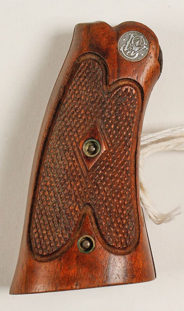 This is a set of two piece walnut grips for the Smith ans Wesson model K frame revolver. Complete with silver S&W medallion. Date: Location: HWAC# 40752