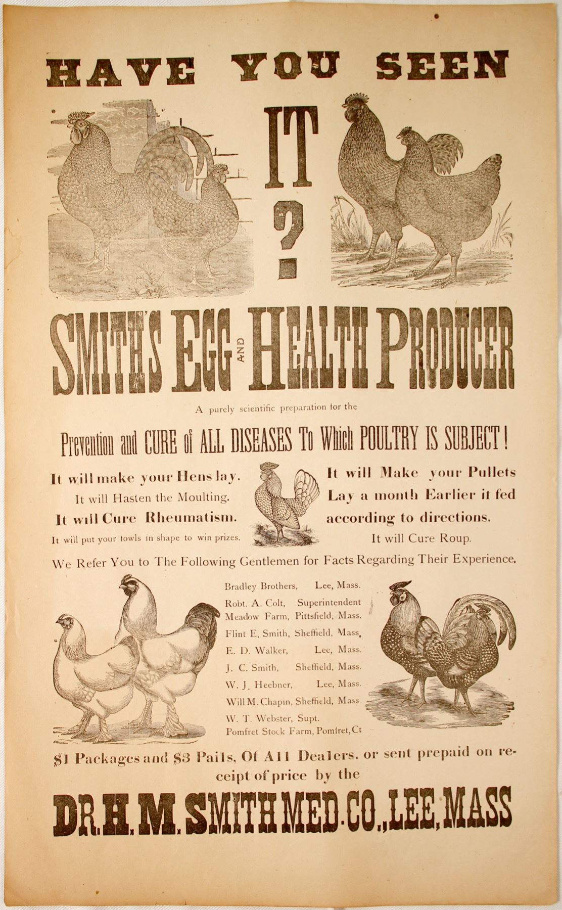 Smith's Egg and Hen Health Producer 22 x 13.5" broadside with 8 chickens.ge State: Massachusetts City: Date: c1880-1900 HWAC# 85178