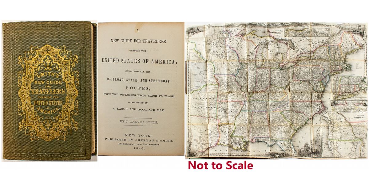 Pocket guide, by J. Calvin Smith, NY. Large fine engraved folding map, with original color in outline of "A New Map for Travellers Through the United States of America Showing the Railroads, Canals & Stage Roads." John Calvin Smith's pocket map of the region displays rail lines around urban areas, with stagecoach lines still providing the final rough ride to sites such as the White Mountains and Moosehead Lake. By the end of the century, railroad lines in New England had quadrupled.With the Distances, by J. Calvin Smith" (27 x 21 4/8 inches). New York : Published by Sherman & Smith, 1846. Original dark green cloth cover, gilt design and type. First edition, exceptionally rare. the first map to depict Dallas, founded in 1841 by John Neely Bryan, only a few years before the Republic of Texas was annexed by the United States in 1845, Dallas county being established in 1846, the year this map was printed. Dallas was incorporated as a city in February of 1856. The fine inset maps include: "Railroad & Canal Routes from Albany to Buffalo "; "Map Showing the Rail Roads between the Cities of New York, Boston & Albany ."; "Rail Road Route from New York to Philadelphia"; "Rail Road Route from Philadelphia to Washington"; "Map of Oregon Northern California Santa Fe &c", surrounded by fine engraved vignette views.