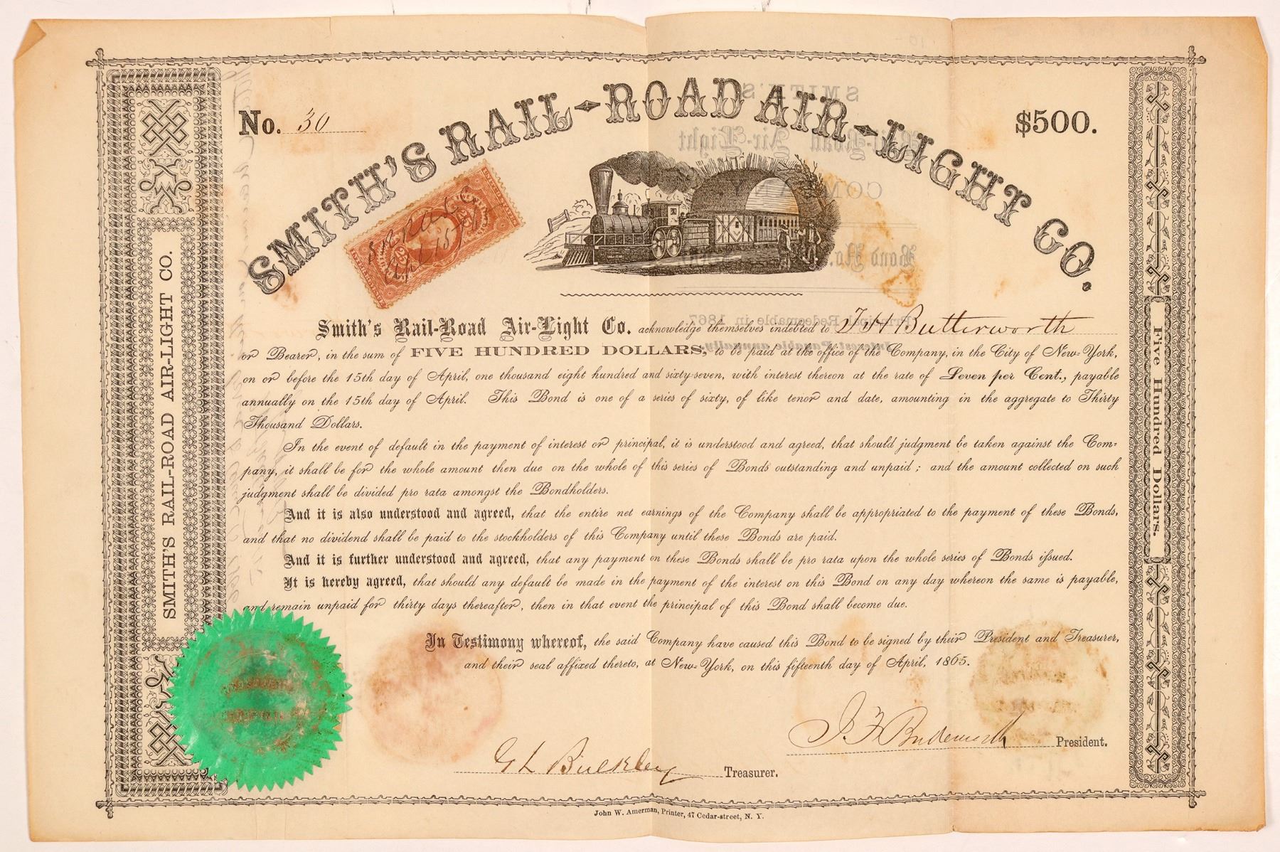 Incorp 1865 New York. #30, I/U, $500 bearer bond, due 1867. Issued April 15, 1865, signed by Pres. BLACK, embossed green seal, vignette top 4-4-0 @ depot. Revenue stamp left under title. Only year reported of issue. John W. Amerman printer. VF Ken Prag Collection