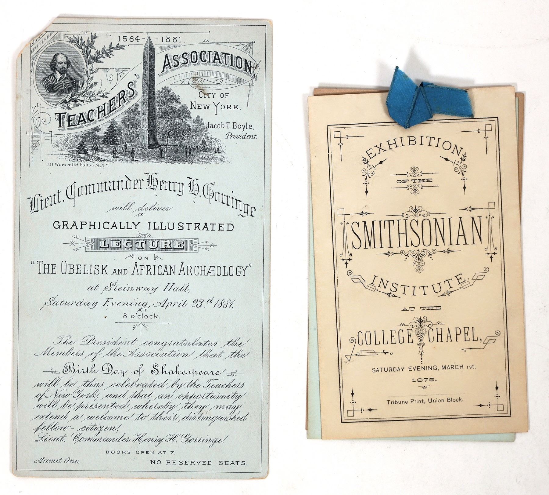 1879 Smithsonian Institute college chapel 6pp program and 1881 Teachers Association lecture announcement card with upper left chip.