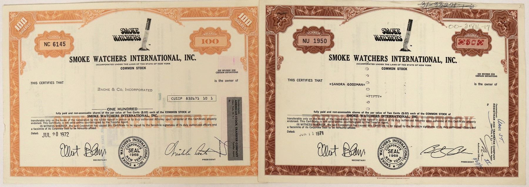 Smoke Watchers was incorporated in 1969. 1) Reddish brown. 1971. Includes logo of a cigarette being put our. Number NU 1940. 2) Orange. 1972. Same logo. Number NC 6145. The first is in good condition. The second is near pristine.