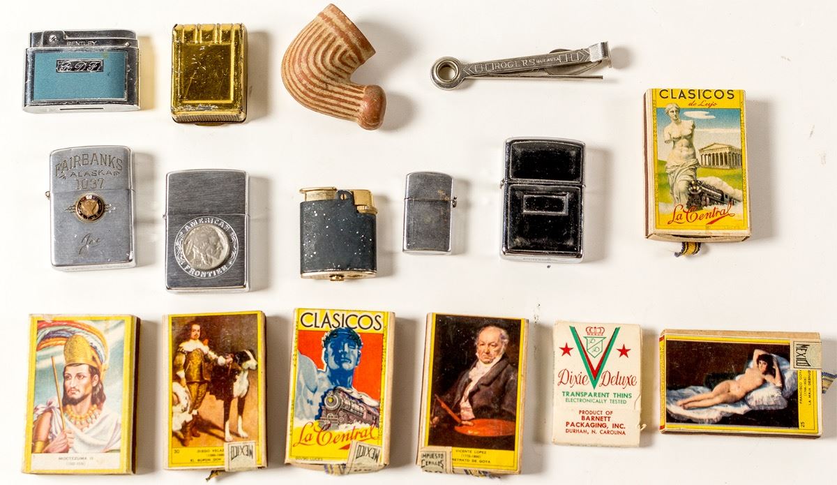 Variety of smoking collectibles that includes 3 zippo lighters, 2 flip-cap lighters, 6 different boxes of Clasicos matches, and a small pipe with cleaning tool. City: State: Date: Inventory# 38302