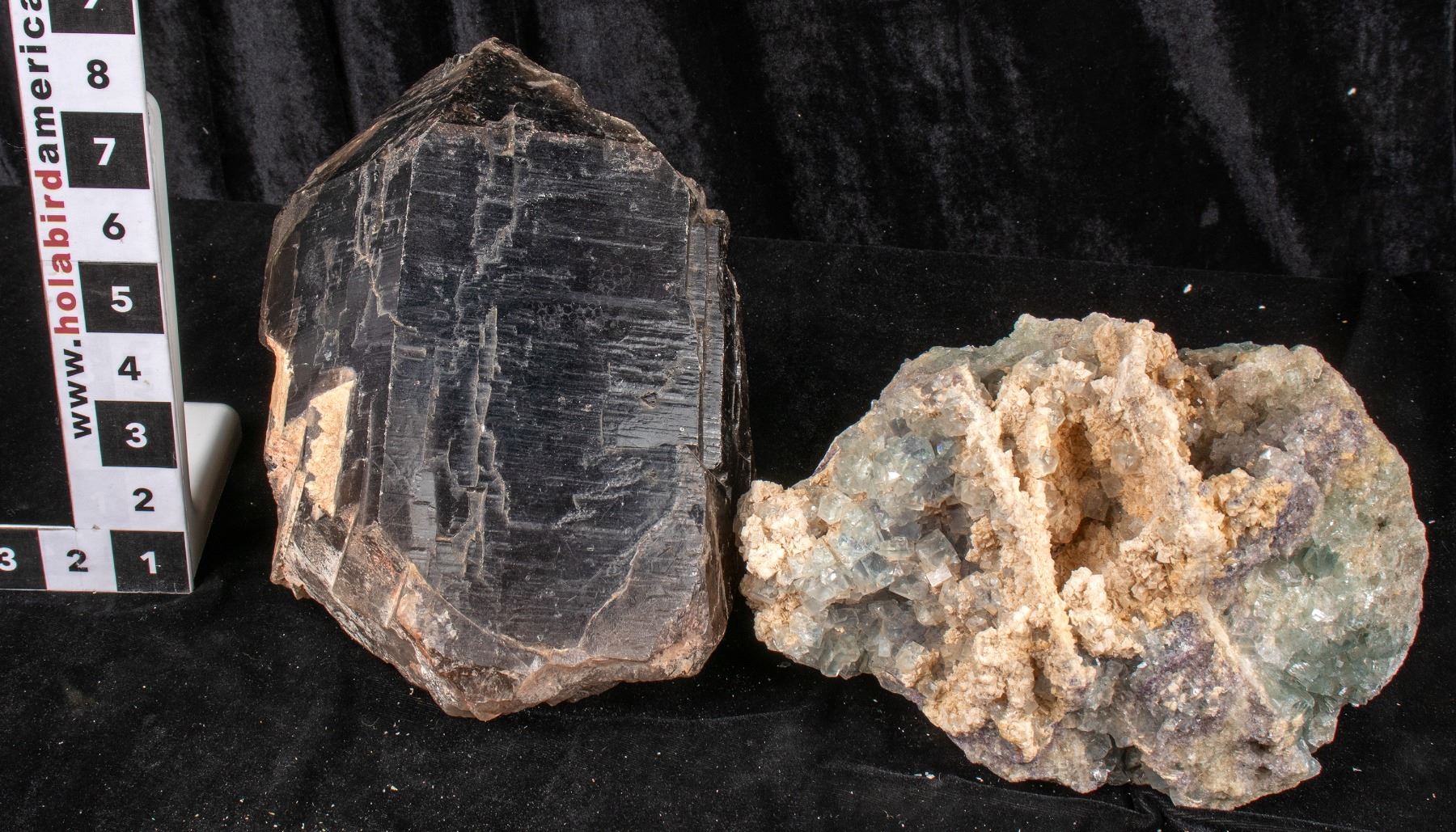 2 large specimens: large single smoky quartz with cleaved side 9" x 7" x 6"; plate of purple, green, and blue fluorite crystals on calcite 8" x 5.5" x 4" China Chunlin Zhu Collection