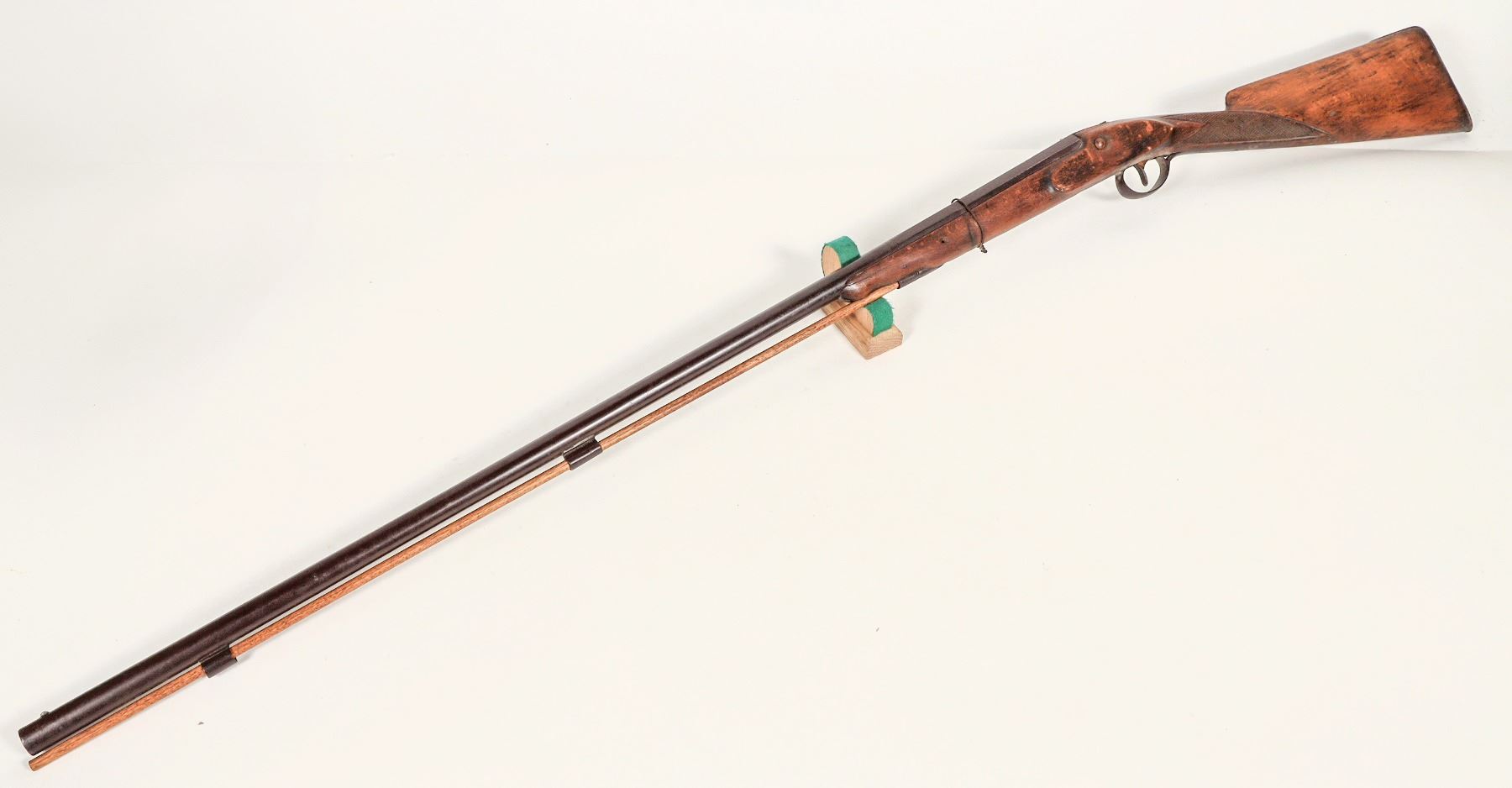 This is a 16 gauge shotgun with percussion ignition. The lock is missing in action and appears to be a European import from the 1870s. The barrel is sound and is part octagon to round with the transitional wedding band between the two. The stock is straight grip indicating a European origin. Overall length is 53.5 in. with a 37.25 in. barrel. No FFL required. Please see photo for details.