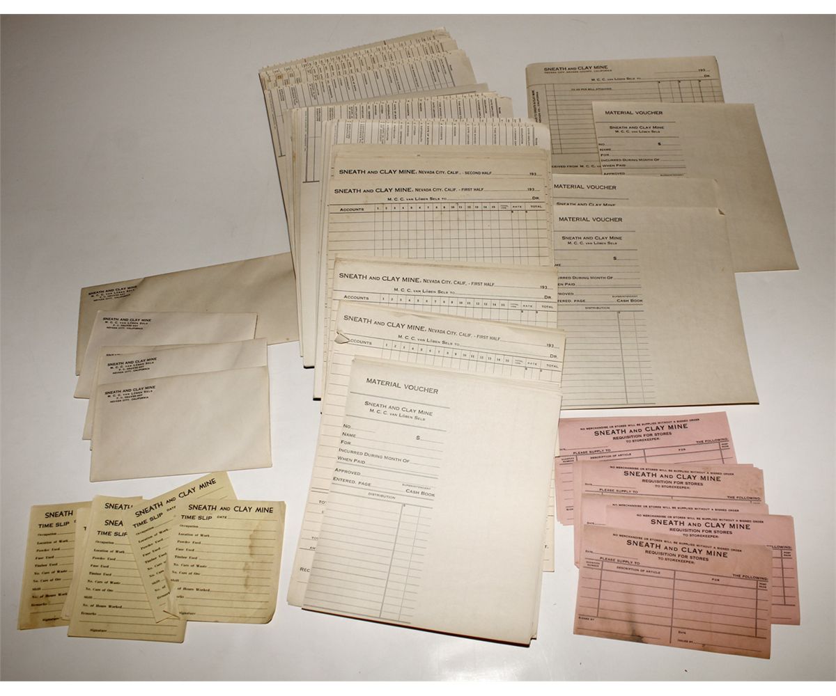 This lot includes: unused covers, unused time slips, unused store requisition forms, blank vouchers c.1930s, unused employee time ledger sheets, and many unused accounting ledger sheets (c.1930s). 100+. The Sneath and Clay Mine (also called the Phoenix Mine) was a large producer located in the Nevada City Mining District. It was discovered in 1862, shutdown in 1867, and reopened in 1915. Date 1930s Nevada City, CA hwac 20277